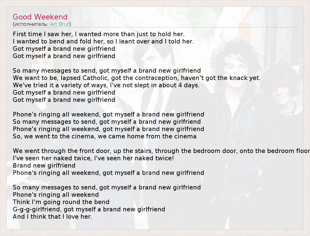 First time I saw her, I wanted more than just to hold her. I wanted to bend and fold her, so I leant over and I told her. Got myself a brand new girlfriend Got myself a brand new girlfriend So many messages to send, got myself a brand new girlfriend We want to be, lapsed Catholic, got the contraception, haven't got the knack yet. We've tried it a variety of ways, I've not slept in about 4 days. Got myself a brand new girlfriend Got myself a brand new girlfriend Phone's ringing all weekend, got myself a brand new girlfriend So many messages to send, got myself a brand new girlfriend Phone's ringing all weekend, got myself a brand new girlfriend So, we went to the cinema, we came home from the cinema We went through the front door, up the stairs, through the bedroom door, onto the bedroom floor I've seen her naked twice, I've seen her naked twice! Brand new girlfriend Phone's ringing all weekend, got myself a brand new girlfriend So many messages to send, got myself a brand new girlfriend Phone's ringing all weekend Think I'm going round the bend G-g-g-girlfriend, got myself a brand new girlfriend And I think that I love her.