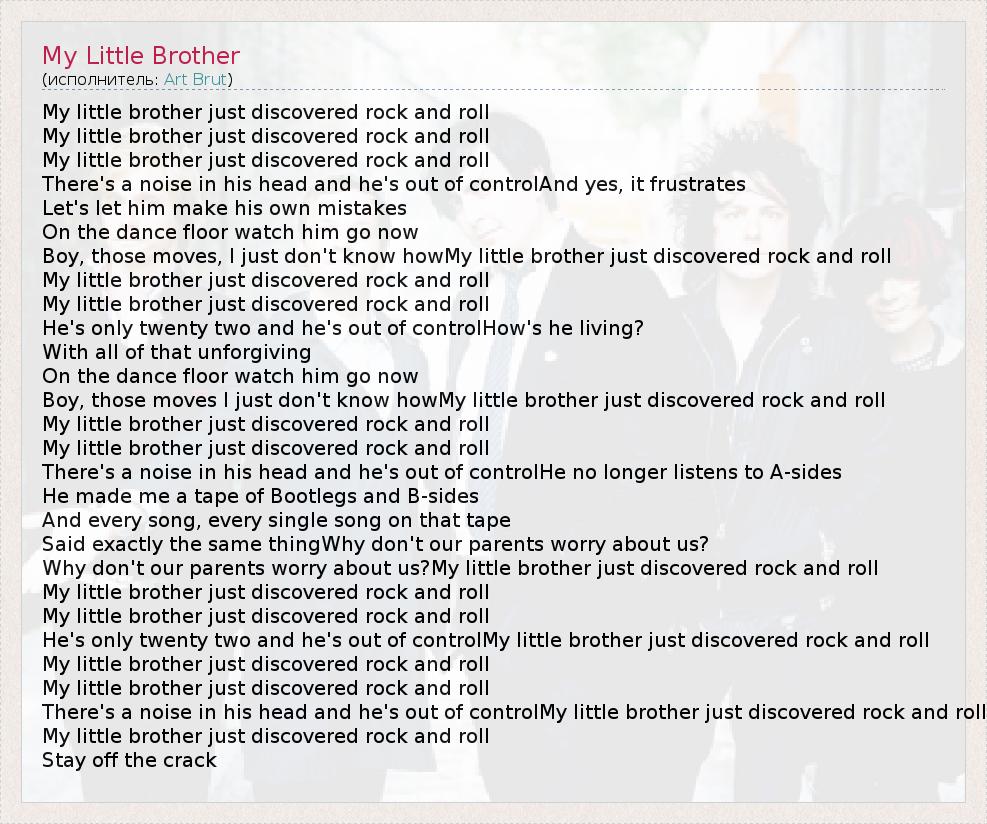 My little brother just discovered rock and roll My little brother just discovered rock and roll My little brother just discovered rock and roll There's a noise in his head and he's out of controlAnd yes, it frustrates Let's let him make his own mistakes On the dance floor watch him go now Boy, those moves, I just don't know howMy little brother just discovered rock and roll My little brother just discovered rock and roll My little brother just discovered rock and roll He's only twenty two and he's out of controlHow's he living? With all of that unforgiving On the dance floor watch him go now Boy, those moves I just don't know howMy little brother just discovered rock and roll My little brother just discovered rock and roll My little brother just discovered rock and roll There's a noise in his head and he's out of controlHe no longer listens to A-sides He made me a tape of Bootlegs and B-sides And every song, every single song on that tape Said exactly the same thingWhy don't our parents worry about us? Why don't our parents worry about us?My little brother just discovered rock and roll My little brother just discovered rock and roll My little brother just discovered rock and roll He's only twenty two and he's out of controlMy little brother just discovered rock and roll My little brother just discovered rock and roll My little brother just discovered rock and roll There's a noise in his head and he's out of controlMy little brother just discovered rock and roll My little brother just discovered rock and roll Stay off the crack