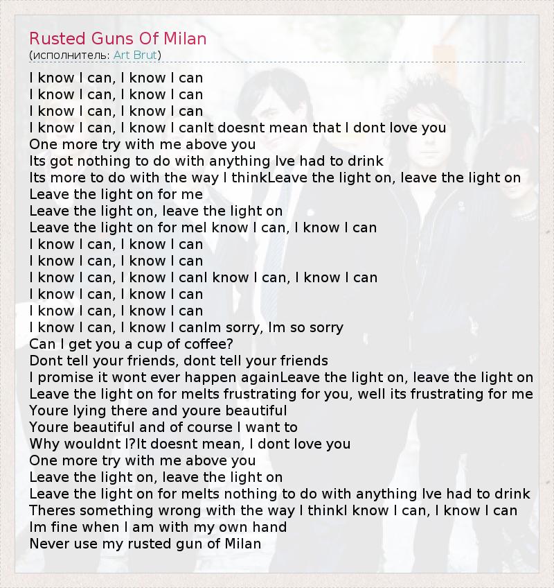 I know I can, I know I can I know I can, I know I can I know I can, I know I can I know I can, I know I canIt doesnt mean that I dont love you One more try with me above you Its got nothing to do with anything Ive had to drink Its more to do with the way I thinkLeave the light on, leave the light on Leave the light on for me Leave the light on, leave the light on Leave the light on for meI know I can, I know I can I know I can, I know I can I know I can, I know I can I know I can, I know I canI know I can, I know I can I know I can, I know I can I know I can, I know I can I know I can, I know I canIm sorry, Im so sorry Can I get you a cup of coffee? Dont tell your friends, dont tell your friends I promise it wont ever happen againLeave the light on, leave the light on Leave the light on for meIts frustrating for you, well its frustrating for me Youre lying there and youre beautiful Youre beautiful and of course I want to Why wouldnt I?It doesnt mean, I dont love you One more try with me above you Leave the light on, leave the light on Leave the light on for meIts nothing to do with anything Ive had to drink Theres something wrong with the way I thinkI know I can, I know I can Im fine when I am with my own hand Never use my rusted gun of Milan