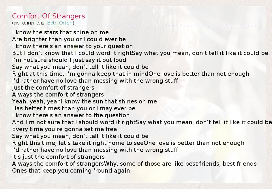 I know the stars that shine on me Are brighter than you or I could ever be I know there's an answer to your question But I don't know that I could word it rightSay what you mean, don't tell it like it could be I'm not sure should I just say it out loud Say what you mean, don't tell it like it could be Right at this time, I'm gonna keep that in mindOne love is better than not enough I'd rather have no love than messing with the wrong stuff Just the comfort of strangers Always the comfort of strangers Yeah, yeah, yeahI know the sun that shines on me Has better times than you or I may ever be I know there's an answer to the question And I'm not sure that I should word it rightSay what you mean, don't tell it like it could be Every time you're gonna set me free Say what you mean, don't tell it like it could be Right this time, let's take it right home to seeOne love is better than not enough I'd rather have no love than messing with the wrong stuff It's just the comfort of strangers Always the comfort of strangersWhy, some of those are like best friends, best friends Ones that keep you coming 'round again