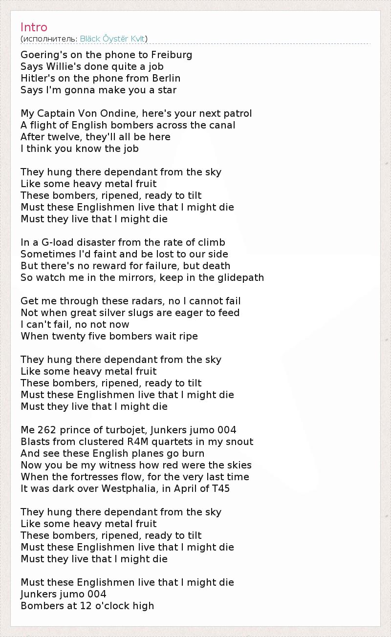 Goering's on the phone to Freiburg Says Willie's done quite a job Hitler's on the phone from Berlin Says I'm gonna make you a star My Captain Von Ondine, here's your next patrol A flight of English bombers across the canal After twelve, they'll all be here I think you know the job They hung there dependant from the sky Like some heavy metal fruit These bombers, ripened, ready to tilt Must these Englishmen live that I might die Must they live that I might die In a G-load disaster from the rate of climb Sometimes I'd faint and be lost to our side But there's no reward for failure, but death So watch me in the mirrors, keep in the glidepath Get me through these radars, no I cannot fail Not when great silver slugs are eager to feed I can't fail, no not now When twenty five bombers wait ripe They hung there dependant from the sky Like some heavy metal fruit These bombers, ripened, ready to tilt Must these Englishmen live that I might die Must they live that I might die Me 262 prince of turbojet, Junkers jumo 004 Blasts from clustered R4M quartets in my snout And see these English planes go burn Now you be my witness how red were the skies When the fortresses flow, for the very last time It was dark over Westphalia, in Аpril of T45 They hung there dependant from the sky Like some heavy metal fruit These bombers, ripened, ready to tilt Must these Englishmen live that I might die Must they live that I might die Must these Englishmen live that I might die Junkers jumo 004 Bombers at 12 o'clock high