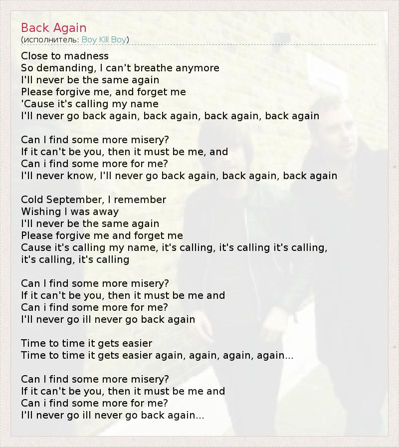 Близко к безумию Так вызывающе, я не могу дышать больше Я никогда не стану прежним Пожалуйста, прости и забудь меня Потому что это зовёт меня Я никогда не вернусь назад, назад, назад, назад Могу ли я найти ещё большее страдание? Если не ты, то это должен быть я, и Могу ля я найти нечто большее для себя? Я никогда не узнаю, я никогда не вернусь назад, назад, назад Холодный сентябрь, я помню Я загадал желание Я никогда не стану прежним Пожалуйста, прости и забудь меня Потому что это зовёт меня, зовёт, зовёт, зовёт, зовёт, зовёт Могу ли я найти ещё большее страдание? Если не ты, то это должен быть я, и Могу ля я найти нечто большее для себя? Я никогда не узнаю, я никогда не вернусь Раз от раза становится легче Раз от раза становится легче, снова, снова, снова, снова… Могу ли я найти ещё большее страдание? Если не ты, то это должен быть я, и Могу ля я найти нечто большее для себя? Я никогда не узнаю, я никогда не вернусь назад, назад, назад, назад, назад, назад, назад, назад, назад