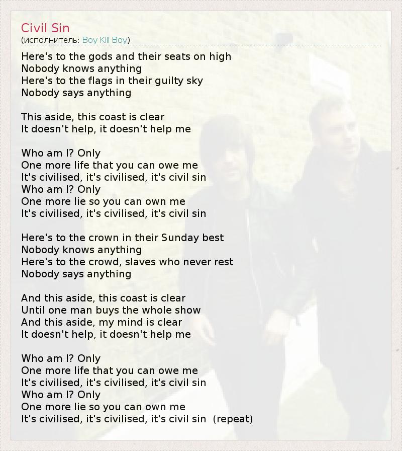 Here's to the gods and their seats on high Nobody knows anything Here's to the flags in their guilty sky Nobody says anything This aside, this coast is clear It doesn't help, it doesn't help me Who am I? Only One more life that you can owe me It's civilised, it's civilised, it's civil sin Who am I? Only One more lie so you can own me It's civilised, it's civilised, it's civil sin Here's to the crown in their Sunday best Nobody knows anything Here's to the crowd, slaves who never rest Nobody says anything And this aside, this coast is clear Until one man buys the whole show And this aside, my mind is clear It doesn't help, it doesn't help me Who am I? Only One more life that you can owe me It's civilised, it's civilised, it's civil sin Who am I? Only One more lie so you can own me It's civilised, it's civilised, it's civil sin (repeat)