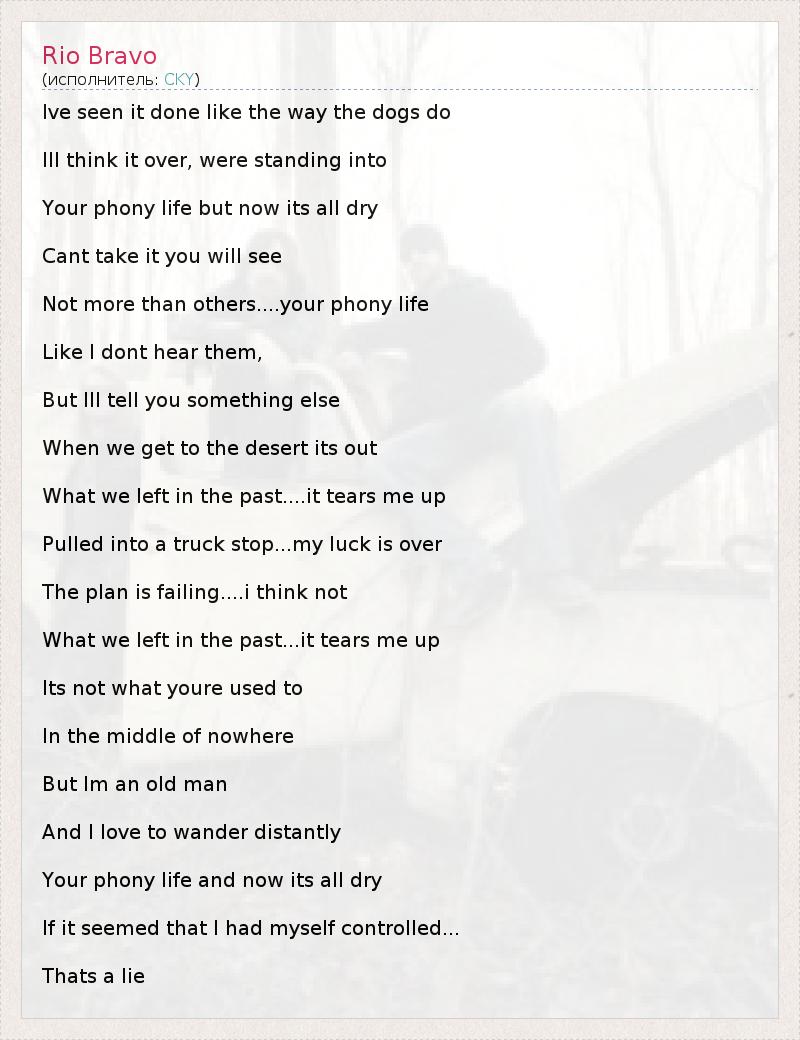 Ive seen it done like the way the dogs do Ill think it over, were standing into Your phony life but now its all dry Cant take it you will see Not more than others....your phony life Like I dont hear them, But Ill tell you something else When we get to the desert its out What we left in the past....it tears me up Pulled into a truck stop...my luck is over The plan is failing....i think not What we left in the past...it tears me up Its not what youre used to In the middle of nowhere But Im an old man And I love to wander distantly Your phony life and now its all dry If it seemed that I had myself controlled... Thats a lie