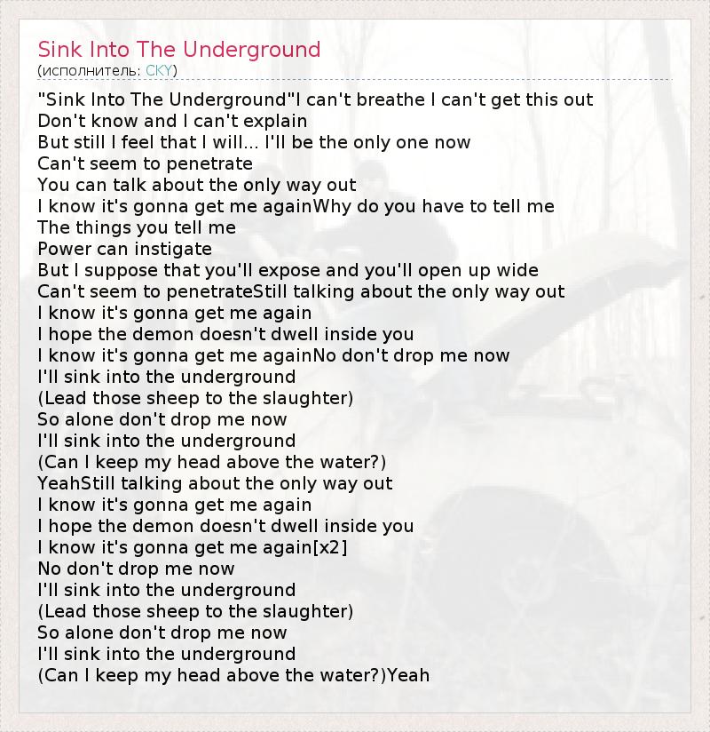 "Sink Into The Underground"I can't breathe I can't get this out Don't know and I can't explain But still I feel that I will... I'll be the only one now Can't seem to penetrate You can talk about the only way out I know it's gonna get me againWhy do you have to tell me The things you tell me Power can instigate But I suppose that you'll expose and you'll open up wide Can't seem to penetrateStill talking about the only way out I know it's gonna get me again I hope the demon doesn't dwell inside you I know it's gonna get me againNo don't drop me now I'll sink into the underground (Lead those sheep to the slaughter) So alone don't drop me now I'll sink into the underground (Can I keep my head above the water?) YeahStill talking about the only way out I know it's gonna get me again I hope the demon doesn't dwell inside you I know it's gonna get me again[x2] No don't drop me now I'll sink into the underground (Lead those sheep to the slaughter) So alone don't drop me now I'll sink into the underground (Can I keep my head above the water?)Yeah