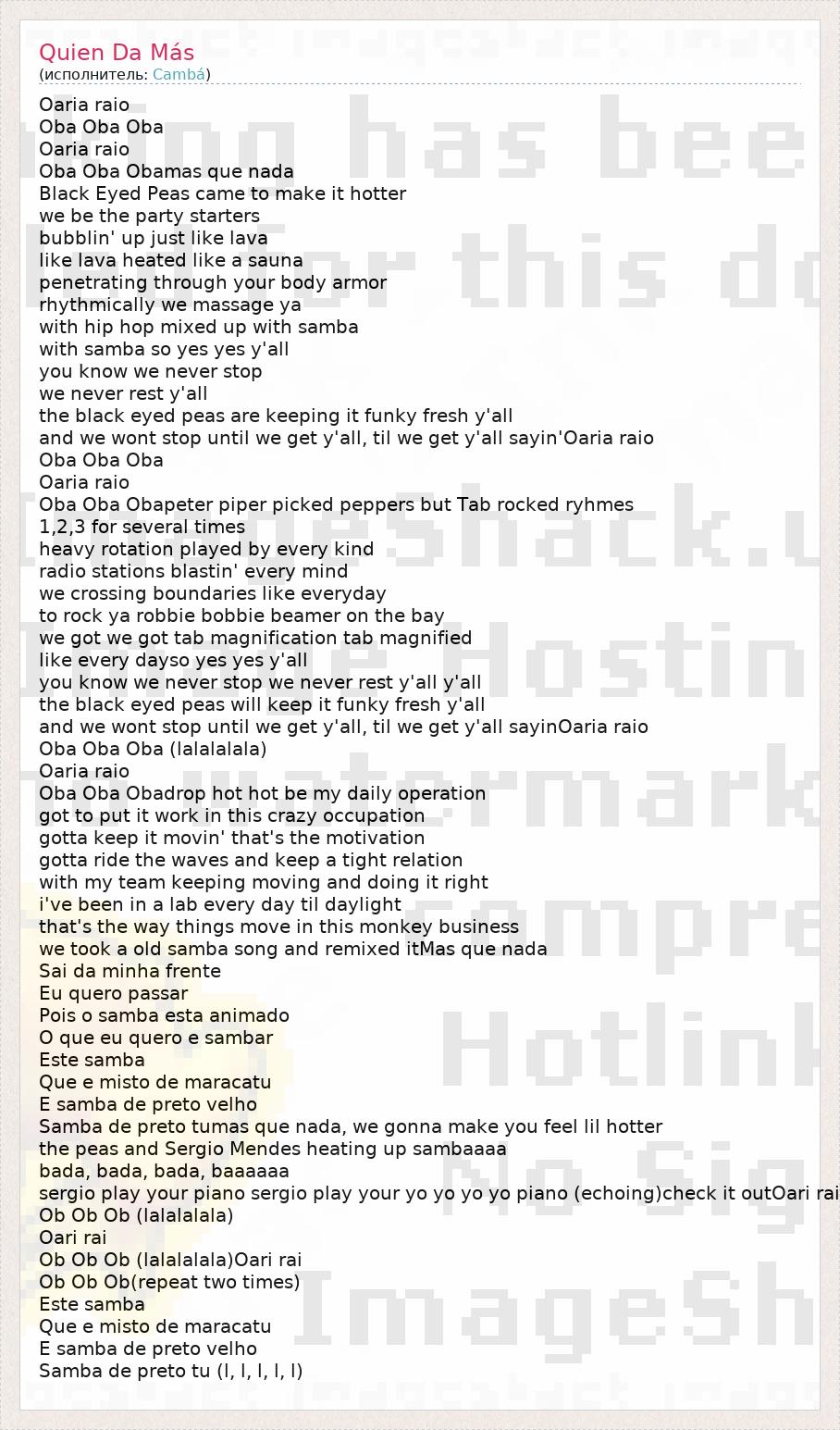 Oaria raio Oba Oba Oba Oaria raio Oba Oba Obamas que nada Black Eyed Peas came to make it hotter we be the party starters bubblin' up just like lava like lava heated like a sauna penetrating through your body armor rhythmically we massage ya with hip hop mixed up with samba with samba so yes yes y'all you know we never stop we never rest y'all the black eyed peas are keeping it funky fresh y'all and we wont stop until we get y'all, til we get y'all sayin'Oaria raio Oba Oba Oba Oaria raio Oba Oba Obapeter piper picked peppers but Tab rocked ryhmes 1,2,3 for several times heavy rotation played by every kind radio stations blastin' every mind we crossing boundaries like everyday to rock ya robbie bobbie beamer on the bay we got we got tab magnification tab magnified like every dayso yes yes y'all you know we never stop we never rest y'all y'all the black eyed peas will keep it funky fresh y'all and we wont stop until we get y'all, til we get y'all sayinOaria raio Oba Oba Oba (lalalalala) Oaria raio Oba Oba Obadrop hot hot be my daily operation got to put it work in this crazy occupation gotta keep it movin' that's the motivation gotta ride the waves and keep a tight relation with my team keeping moving and doing it right i've been in a lab every day til daylight that's the way things move in this monkey business we took a old samba song and remixed itMas que nada Sai da minha frente Eu quero passar Pois o samba esta animado O que eu quero e sambar Este samba Que e misto de maracatu E samba de preto velho Samba de preto tumas que nada, we gonna make you feel lil hotter the peas and Sergio Mendes heating up sambaaaa bada, bada, bada, baaaaaa sergio play your piano sergio play your yo yo yo yo piano (echoing)check it outOari rai Ob Ob Ob (lalalalala) Oari rai Ob Ob Ob (lalalalala)Oari rai Ob Ob Ob(repeat two times) Este samba Que e misto de maracatu E samba de preto velho Samba de preto tu (l, l, l, l, l)