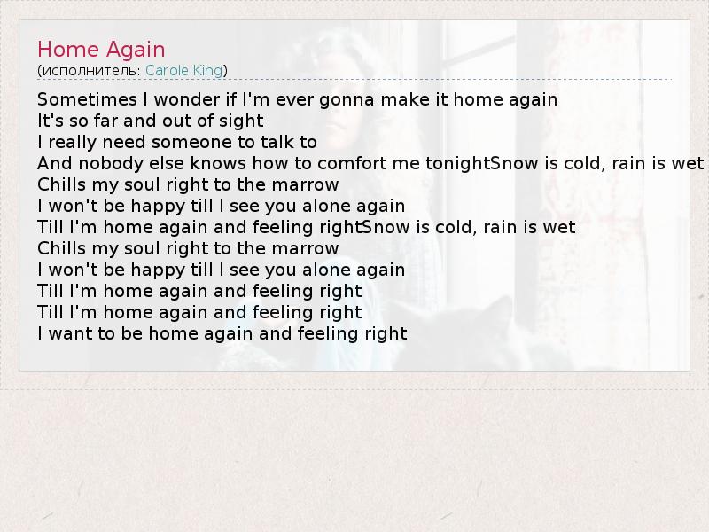 Sometimes I wonder if I'm ever gonna make it home again It's so far and out of sight I really need someone to talk to And nobody else knows how to comfort me tonightSnow is cold, rain is wet Chills my soul right to the marrow I won't be happy till I see you alone again Till I'm home again and feeling rightSnow is cold, rain is wet Chills my soul right to the marrow I won't be happy till I see you alone again Till I'm home again and feeling right Till I'm home again and feeling right I want to be home again and feeling right