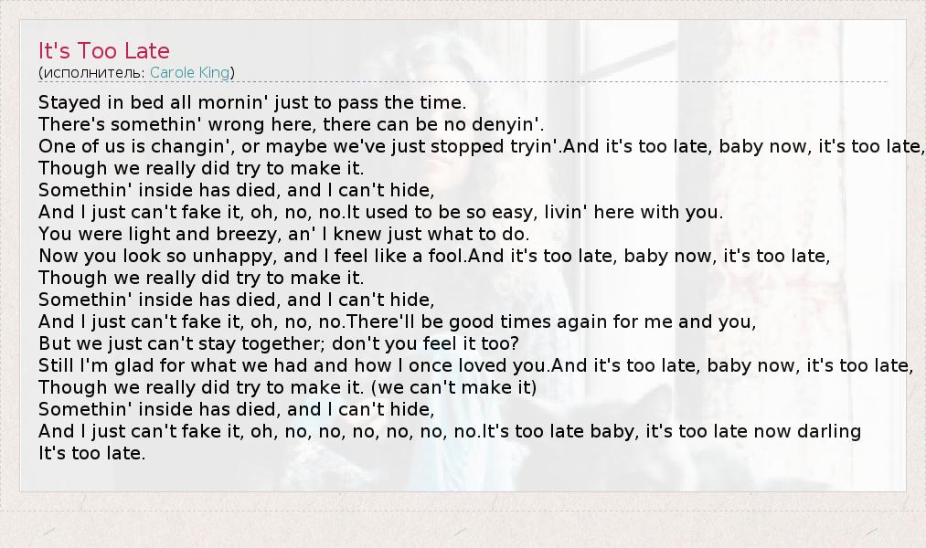 А как ты думаешь, о чем песня "It's Too Late" ?