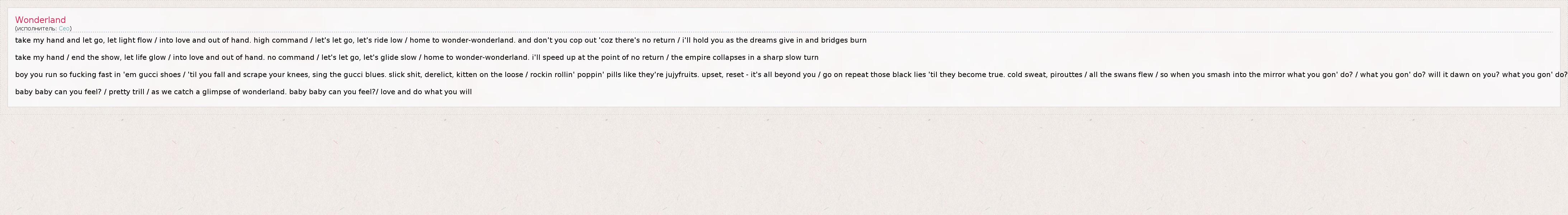 take my hand and let go, let light flow / into love and out of hand. high command / let's let go, let's ride low / home to wonder-wonderland. and don't you cop out 'coz there's no return / i'll hold you as the dreams give in and bridges burn take my hand / end the show, let life glow / into love and out of hand. no command / let's let go, let's glide slow / home to wonder-wonderland. i'll speed up at the point of no return / the empire collapses in a sharp slow turn boy you run so fucking fast in 'em gucci shoes / 'til you fall and scrape your knees, sing the gucci blues. slick shit, derelict, kitten on the loose / rockin rollin' poppin' pills like they're jujyfruits. upset, reset - it's all beyond you / go on repeat those black lies 'til they become true. cold sweat, pirouttes / all the swans flew / so when you smash into the mirror what you gon' do? / what you gon' do? will it dawn on you? what you gon' do? baby baby can you feel? / pretty trill / as we catch a glimpse of wonderland. baby baby can you feel?/ love and do what you will
