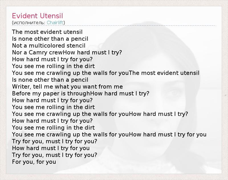 The most evident utensil Is none other than a pencil Not a multicolored stencil Nor a Camry crewHow hard must I try? How hard must I try for you? You see me rolling in the dirt You see me crawling up the walls for youThe most evident utensil Is none other than a pencil Writer, tell me what you want from me Before my paper is throughHow hard must I try? How hard must I try for you? You see me rolling in the dirt You see me crawling up the walls for youHow hard must I try? How hard must I try for you? You see me rolling in the dirt You see me crawling up the walls for youHow hard must I try for you Try for you, must I try for you? How hard must I try for you Try for you, must I try for you? For you, for you