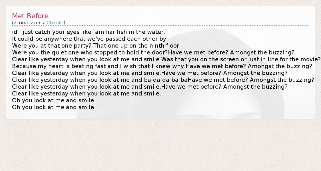 id I just catch your eyes like familiar fish in the water. It could be anywhere that we've passed each other by. Were you at that one party? That one up on the ninth floor. Were you the quiet one who stopped to hold the door?Have we met before? Amongst the buzzing? Clear like yesterday when you look at me and smile.Was that you on the screen or just in line for the movie? Because my heart is beating fast and I wish that I knew why.Have we met before? Amongst the buzzing? Clear like yesterday when you look at me and smile.Have we met before? Amongst the buzzing? Clear like yesterday when you look at me and ba-da-da-ba-baHave we met before? Amongst the buzzing? Clear like yesterday when you look at me and smile.Have we met before? Amongst the buzzing? Clear like yesterday when you look at me and smile. Oh you look at me and smile. Oh you look at me and smile.