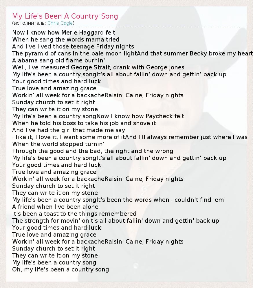 Now I know how Merle Haggard felt When he sang the words mama tried And I've lived those teenage Friday nights The pyramid of cans in the pale moon lightAnd that summer Becky broke my heart Alabama sang old flame burnin' Well, I've measured George Strait, drank with George Jones My life's been a country songIt's all about fallin' down and gettin' back up Your good times and hard luck True love and amazing grace Workin' all week for a backacheRaisin' Caine, Friday nights Sunday church to set it right They can write it on my stone My life's been a country songNow I know how Paycheck felt When he told his boss to take his job and shove it And I've had the girl that made me say I like it, I love it, I want some more of itAnd I'll always remember just where I was When the world stopped turnin' Through the good and the bad, the right and the wrong My life's been a country songIt's all about fallin' down and gettin' back up Your good times and hard luck True love and amazing grace Workin' all week for a backacheRaisin' Caine, Friday nights Sunday church to set it right They can write it on my stone My life's been a country songIt's been the words when I couldn't find 'em A friend when I've been alone It's been a toast to the things remembered The strength for movin' onIt's all about fallin' down and gettin' back up Your good times and hard luck True love and amazing grace Workin' all week for a backacheRaisin' Caine, Friday nights Sunday church to set it right They can write it on my stone My life's been a country song Oh, my life's been a country song