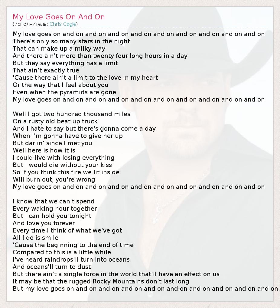 My love goes on and on and on and on and on and on and on and on and on and on There's only so many stars in the night That can make up a milky way And there ain't more than twenty four long hours in a day But they say everything has a limit That ain't exactly true 'Cause there ain't a limit to the love in my heart Or the way that I feel about you Even when the pyramids are gone My love goes on and on and on and on and on and on and on and on and on and on Well I got two hundred thousand miles On a rusty old beat up truck And I hate to say but there's gonna come a day When I'm gonna have to give her up But darlin' since I met you Well here is how it is I could live with losing everything But I would die without your kiss So if you think this fire we lit inside Will burn out, you're wrong My love goes on and on and on and on and on and on and on and on and on and on I know that we can't spend Every waking hour together But I can hold you tonight And love you forever Every time I think of what we've got All I do is smile 'Cause the beginning to the end of time Compared to this is a little while I've heard raindrops'll turn into oceans And oceans'll turn to dust But there ain't a single force in the world that'll have an effect on us It may be that the rugged Rocky Mountains don't last long But my love goes on and on and on and on and on and on and on and on and on and on.