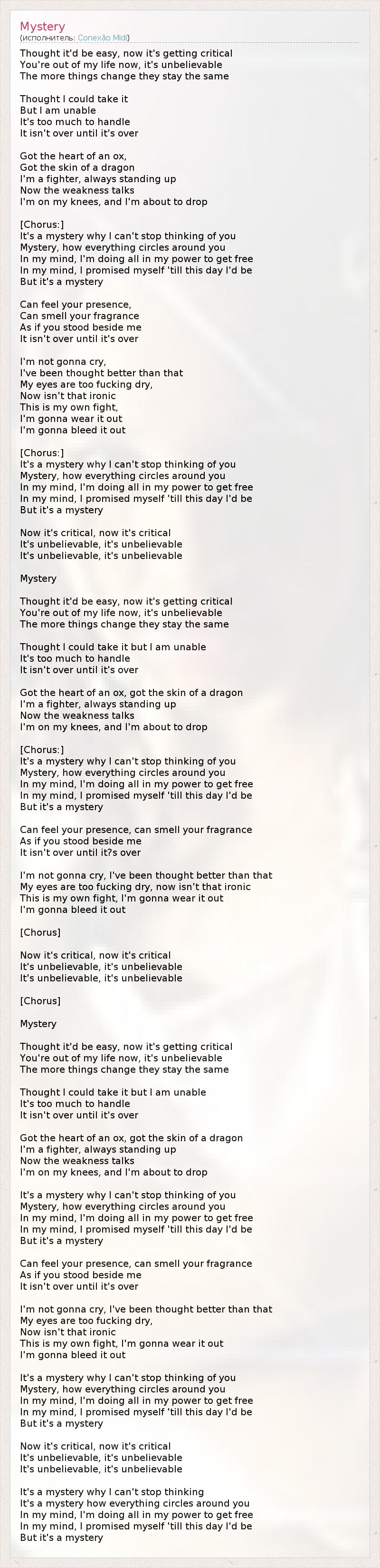 Thought it'd be easy, now it's getting critical You're out of my life now, it's unbelievable The more things change they stay the same Thought I could take it But I am unable It's too much to handle It isn't over until it's over Got the heart of an ox, Got the skin of a dragon I'm a fighter, always standing up Now the weakness talks I'm on my knees, and I'm about to drop [Chorus:] It's a mystery why I can't stop thinking of you Mystery, how everything circles around you In my mind, I'm doing all in my power to get free In my mind, I promised myself 'till this day I'd be But it's a mystery Can feel your presence, Can smell your fragrance As if you stood beside me It isn't over until it's over I'm not gonna cry, I've been thought better than that My eyes are too fucking dry, Now isn't that ironic This is my own fight, I'm gonna wear it out I'm gonna bleed it out [Chorus:] It's a mystery why I can't stop thinking of you Mystery, how everything circles around you In my mind, I'm doing all in my power to get free In my mind, I promised myself 'till this day I'd be But it's a mystery Now it's critical, now it's critical It's unbelievable, it's unbelievable It's unbelievable, it's unbelievable Mystery Thought it'd be easy, now it's getting critical You're out of my life now, it's unbelievable The more things change they stay the same Thought I could take it but I am unable It's too much to handle It isn't over until it's over Got the heart of an ox, got the skin of a dragon I'm a fighter, always standing up Now the weakness talks I'm on my knees, and I'm about to drop [Chorus:] It's a mystery why I can't stop thinking of you Mystery, how everything circles around you In my mind, I'm doing all in my power to get free In my mind, I promised myself 'till this day I'd be But it's a mystery Can feel your presence, can smell your fragrance As if you stood beside me It isn't over until it?s over I'm not gonna cry, I've been thought better than that My eyes are too fucking dry, now isn't that ironic This is my own fight, I'm gonna wear it out I'm gonna bleed it out [Chorus] Now it's critical, now it's critical It's unbelievable, it's unbelievable It's unbelievable, it's unbelievable [Chorus] Mystery Thought it'd be easy, now it's getting critical You're out of my life now, it's unbelievable The more things change they stay the same Thought I could take it but I am unable It's too much to handle It isn't over until it's over Got the heart of an ox, got the skin of a dragon I'm a fighter, always standing up Now the weakness talks I'm on my knees, and I'm about to drop It's a mystery why I can't stop thinking of you Mystery, how everything circles around you In my mind, I'm doing all in my power to get free In my mind, I promised myself 'till this day I'd be But it's a mystery Can feel your presence, can smell your fragrance As if you stood beside me It isn't over until it's over I'm not gonna cry, I've been thought better than that My eyes are too fucking dry, Now isn't that ironic This is my own fight, I'm gonna wear it out I'm gonna bleed it out It's a mystery why I can't stop thinking of you Mystery, how everything circles around you In my mind, I'm doing all in my power to get free In my mind, I promised myself 'till this day I'd be But it's a mystery Now it's critical, now it's critical It's unbelievable, it's unbelievable It's unbelievable, it's unbelievable It's a mystery why I can't stop thinking It's a mystery how everything circles around you In my mind, I'm doing all in my power to get free In my mind, I promised myself 'till this day I'd be But it's a mystery