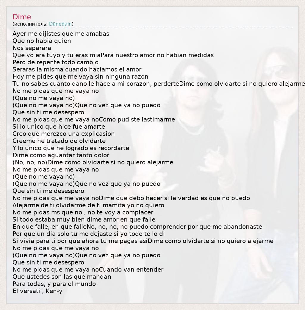 Ayer me dijistes que me amabas Que no habia quien Nos separara Que yo era tuyo y tu eras miaPara nuestro amor no habian medidas Pero de repente todo cambio Seraras la misma cuando haciamos el amor Hoy me pides que me vaya sin ninguna razon Tu no sabes cuanto dano le hace a mi corazon, perderteDime como olvidarte si no quiero alejarme No me pidas que me vaya no (Que no me vaya no) (Que no me vaya no)Que no vez que ya no puedo Que sin ti me desespero No me pidas que me vaya noComo pudiste lastimarme Si lo unico que hice fue amarte Creo que merezco una explicasion Creeme he tratado de olvidarte Y lo unico que he logrado es recordarte Dime como aguantar tanto dolor (No, no, no)Dime como olvidarte si no quiero alejarme No me pidas que me vaya no (Que no me vaya no) (Que no me vaya no)Que no vez que ya no puedo Que sin ti me desespero No me pidas que me vaya noDime que debo hacer si la verdad es que no puedo Alejarme de ti,olvidarme de ti mamita yo no quiero No me pidas ms que no , no te voy a complacer Si todo estaba muy bien dime amor en que falle En que falle, en que falleNo, no, no, no puedo comprender por que me abandonaste Por que un dia solo tu me dejaste si yo todo te lo di Si vivia para ti por que ahora tu me pagas asiDime como olvidarte si no quiero alejarme No me pidas que me vaya no (Que no me vaya no)Que no vez que ya no puedo Que sin ti me desespero No me pidas que me vaya noCuando van entender Que ustedes son las que mandan Para todas, y para el mundo El versatil, Ken-y