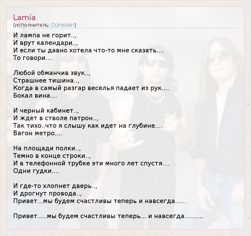 И лампа не горит.., И врут календари.., И если ты давно хотела что-то мне сказать.... То говори.... Любой обманчив звук.., Страшнее тишина.., Когда в самый разгар веселья падает из рук.... Бокал вина.... И черный кабинет.., И ждет в стволе патрон.., Так тихо..что я слышу как идет на глубине.... Вагон метро.... На площади полки.., Темно в конце строки.., И в телефонной трубке эти много лет спустя.... Одни гудки.... И где-то хлопнет дверь.., И дрогнут провода.., Привет...мы будем счастливы теперь и навсегда...... Привет.....мы будем счастливы теперь....и навсегда..........