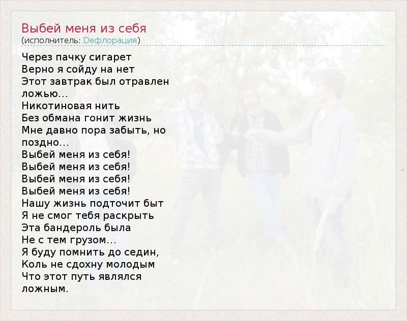 Через пачку сигарет Верно я сойду на нет Этот завтрак был отравлен ложью… Никотиновая нить Без обмана гонит жизнь Мне давно пора забыть, но поздно… Выбей меня из себя! Выбей меня из себя! Выбей меня из себя! Выбей меня из себя! Нашу жизнь подточит быт Я не смог тебя раскрыть Эта бандероль была Не с тем грузом… Я буду помнить до седин, Коль не сдохну молодым Что этот путь являлся ложным.