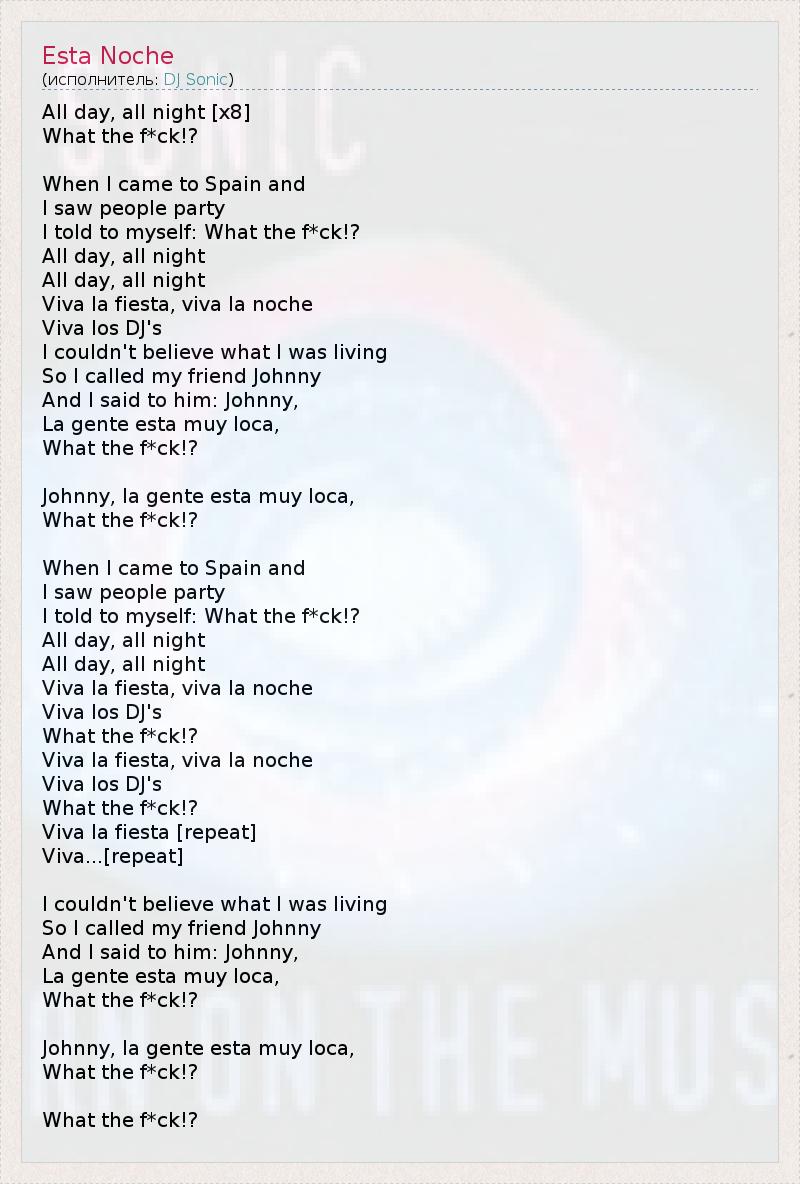 All day, all night [x8] What the f*ck!? When I came to Spain and I saw people party I told to myself: What the f*ck!? All day, all night All day, all night Viva la fiesta, viva la noche Viva los DJ's I couldn't believe what I was living So I called my friend Johnny And I said to him: Johnny, La gente esta muy loca, What the f*ck!? Johnny, la gente esta muy loca, What the f*ck!? When I came to Spain and I saw people party I told to myself: What the f*ck!? All day, all night All day, all night Viva la fiesta, viva la noche Viva los DJ's What the f*ck!? Viva la fiesta, viva la noche Viva los DJ's What the f*ck!? Viva la fiesta [repeat] Viva...[repeat] I couldn't believe what I was living So I called my friend Johnny And I said to him: Johnny, La gente esta muy loca, What the f*ck!? Johnny, la gente esta muy loca, What the f*ck!? What the f*ck!?