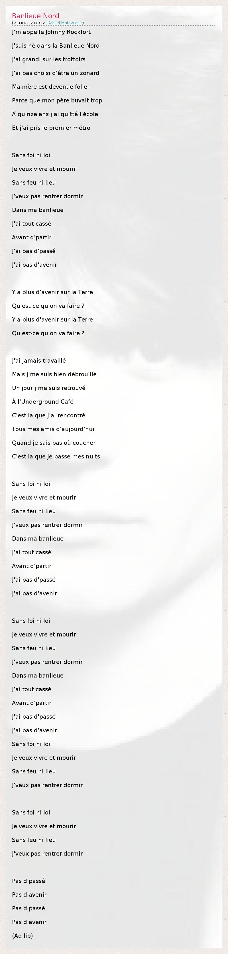 J'm'appelle Johnny Rockfort J'suis né dans la Banlieue Nord J'ai grandi sur les trottoirs J'ai pas choisi d'être un zonard Ma mère est devenue folle Parce que mon père buvait trop À quinze ans j'ai quitté l'école Et j'ai pris le premier métro Sans foi ni loi Je veux vivre et mourir Sans feu ni lieu J'veux pas rentrer dormir Dans ma banlieue J'ai tout cassé Avant d'partir J'ai pas d'passé J'ai pas d'avenir Y a plus d'avenir sur la Terre Qu'est-ce qu'on va faire ? Y a plus d'avenir sur la Terre Qu'est-ce qu'on va faire ? J'ai jamais travaillé Mais j'me suis bien débrouillé Un jour j'me suis retrouvé À l'Underground Café C'est là que j'ai rencontré Tous mes amis d'aujourd'hui Quand je sais pas où coucher C'est là que je passe mes nuits Sans foi ni loi Je veux vivre et mourir Sans feu ni lieu J'veux pas rentrer dormir Dans ma banlieue J'ai tout cassé Avant d'partir J'ai pas d'passé J'ai pas d'avenir Sans foi ni loi Je veux vivre et mourir Sans feu ni lieu J'veux pas rentrer dormir Dans ma banlieue J'ai tout cassé Avant d'partir J'ai pas d'passé J'ai pas d'avenir Sans foi ni loi Je veux vivre et mourir Sans feu ni lieu J'veux pas rentrer dormir Sans foi ni loi Je veux vivre et mourir Sans feu ni lieu J'veux pas rentrer dormir Pas d'passé Pas d'avenir Pas d'passé Pas d'avenir (Ad lib)