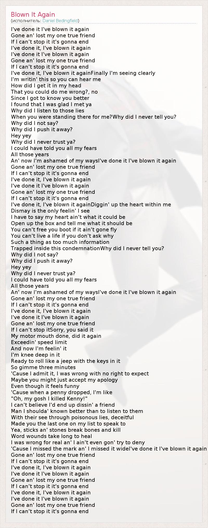 I've done it I've blown it again Gone an' lost my one true friend If I can't stop it it's gonna end I've done it, I've blown it again I've done it I've blown it again Gone an' lost my one true friend If I can't stop it it's gonna end I've done it, I've blown it againFinally I'm seeing clearly I'm writin' this so you can hear me How did I get it in my head That you could do me wrong?, no Since I got to know you better I found that I was glad I met ya Why did I listen to those lies When you were standing there for me?Why did I never tell you? Why did I not say? Why did I push it away? Hey yey Why did I never trust ya? I could have told you all my fears All those years An' now I'm ashamed of my waysI've done it I've blown it again Gone an' lost my one true friend If I can't stop it it's gonna end I've done it, I've blown it again I've done it I've blown it again Gone an' lost my one true friend If I can't stop it it's gonna end I've done it, I've blown it againDiggin' up the heart within me Dismay is the only feelin' I see I have to say my heart ain't what it could be Open up the box and tell me what it should be You can't free you boot if it ain't gone fly You can't live a life if you don't ask why Such a thing as too much information Trapped inside this condemnationWhy did I never tell you? Why did I not say? Why did I push it away? Hey yey Why did I never trust ya? I could have told you all my fears All those years An' now I'm ashamed of my waysI've done it I've blown it again Gone an' lost my one true friend If I can't stop it it's gonna end I've done it, I've blown it again I've done it I've blown it again Gone an' lost my one true friend If I can't stop itSorry, you said it My motor mouth done, did it again Exceedin' speed limit And now I'm feelin' it I'm knee deep in it Ready to roll like a jeep with the keys in it So gimme three minutes 'Cause I admit it, I was wrong with no right to expect Maybe you might just accept my apology Even though it feels funny 'Cause when a penny dropped, I'm like "Oh, my gosh I killed Kenny!" I can't believe I'd end up dissin' a friend Man I shoulda' known better than to listen to them With their see through poisonous lies, deceitful Made you the last one on my list to speak to Yea, sticks an' stones break bones and kill Word wounds take long to heal I was wrong for real an' I ain't even gon' try to deny 'Cause I missed the mark an' I missed it wideI've done it I've blown it again Gone an' lost my one true friend If I can't stop it it's gonna end I've done it, I've blown it again I've done it I've blown it again Gone an' lost my one true friend If I can't stop it it's gonna end I've done it, I've blown it again I've done it I've blown it again Gone an' lost my one true friend If I can't stop it it's gonna end