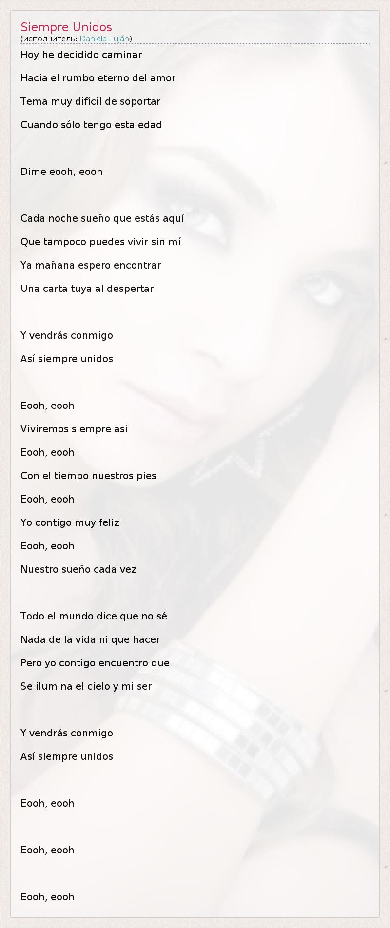 Hoy he decidido caminar Hacia el rumbo eterno del amor Tema muy difícil de soportar Cuando sólo tengo esta edad Dime eooh, eooh Cada noche sueño que estás aquí Que tampoco puedes vivir sin mí Ya mañana espero encontrar Una carta tuya al despertar Y vendrás conmigo Así siempre unidos Eooh, eooh Viviremos siempre así Eooh, eooh Con el tiempo nuestros pies Eooh, eooh Yo contigo muy feliz Eooh, eooh Nuestro sueño cada vez Todo el mundo dice que no sé Nada de la vida ni que hacer Pero yo contigo encuentro que Se ilumina el cielo y mi ser Y vendrás conmigo Así siempre unidos Eooh, eooh Eooh, eooh Eooh, eooh