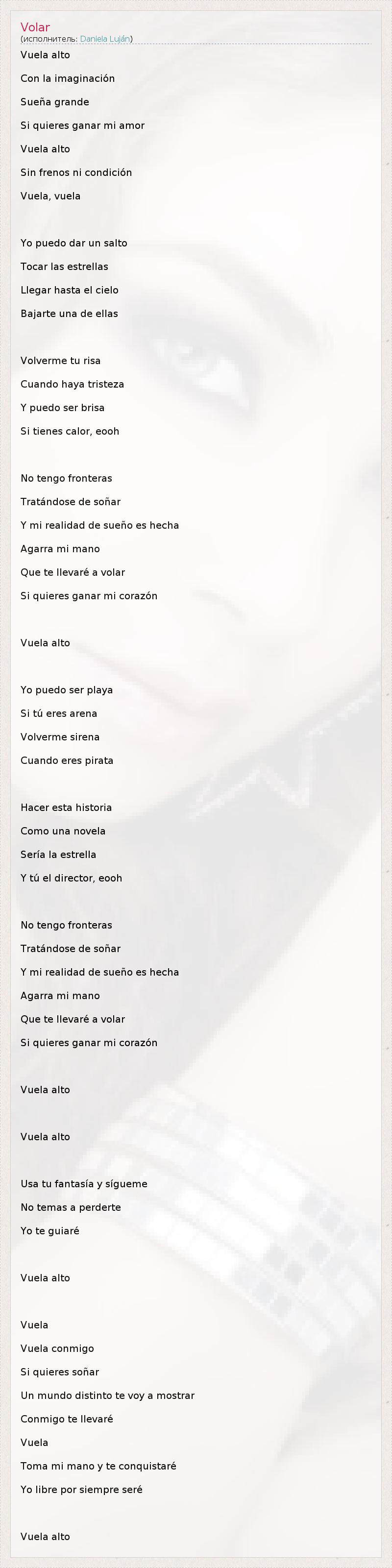 Vuela alto Con la imaginación Sueña grande Si quieres ganar mi amor Vuela alto Sin frenos ni condición Vuela, vuela Yo puedo dar un salto Tocar las estrellas Llegar hasta el cielo Bajarte una de ellas Volverme tu risa Cuando haya tristeza Y puedo ser brisa Si tienes calor, eooh No tengo fronteras Tratándose de soñar Y mi realidad de sueño es hecha Agarra mi mano Que te llevaré a volar Si quieres ganar mi corazón Vuela alto Yo puedo ser playa Si tú eres arena Volverme sirena Cuando eres pirata Hacer esta historia Como una novela Sería la estrella Y tú el director, eooh No tengo fronteras Tratándose de soñar Y mi realidad de sueño es hecha Agarra mi mano Que te llevaré a volar Si quieres ganar mi corazón Vuela alto Vuela alto Usa tu fantasía y sígueme No temas a perderte Yo te guiaré Vuela alto Vuela Vuela conmigo Si quieres soñar Un mundo distinto te voy a mostrar Conmigo te llevaré Vuela Toma mi mano y te conquistaré Yo libre por siempre seré Vuela alto