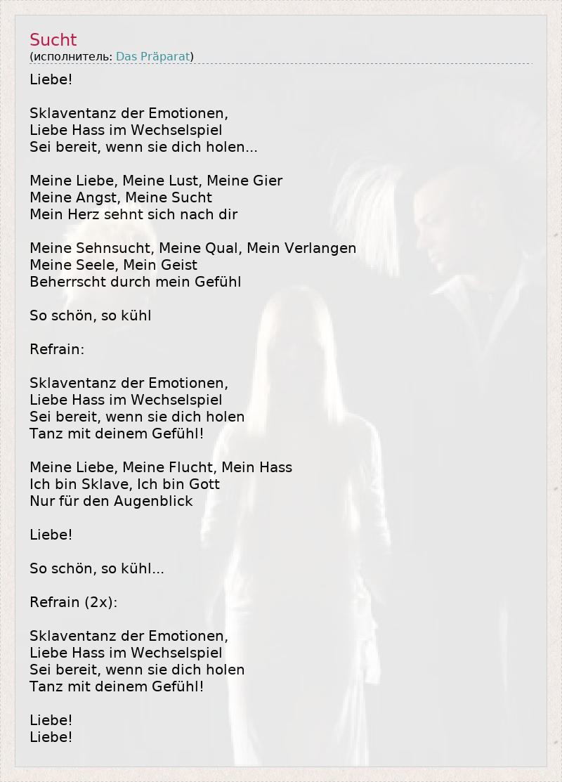 Liebe! Sklaventanz der Emotionen, Liebe Hass im Wechselspiel Sei bereit, wenn sie dich holen... Meine Liebe, Meine Lust, Meine Gier Meine Angst, Meine Sucht Mein Herz sehnt sich nach dir Meine Sehnsucht, Meine Qual, Mein Verlangen Meine Seele, Mein Geist Beherrscht durch mein Gefühl So schön, so kühl Refrain: Sklaventanz der Emotionen, Liebe Hass im Wechselspiel Sei bereit, wenn sie dich holen Tanz mit deinem Gefühl! Meine Liebe, Meine Flucht, Mein Hass Ich bin Sklave, Ich bin Gott Nur für den Augenblick Liebe! So schön, so kühl... Refrain (2x): Sklaventanz der Emotionen, Liebe Hass im Wechselspiel Sei bereit, wenn sie dich holen Tanz mit deinem Gefühl! Liebe! Liebe!