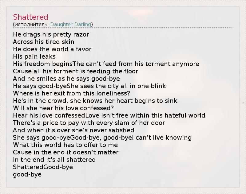 Это интересно:Daughter Darling – американский трип-хоп коллектив, состоящий из вокалистки Натали Уолкер и продюсеров Трэвиса и Стивена Фогелманов.Проживающие в Филадельфии братья Трэвис и Стивен работали с хип-хоп артистами более 10 лет до образования Daughter Darling. Стивен заболел хип-хопом в возрасте 13 лет, а его младший брат Трэвис начал эксперименты с сэмплированием и созданием композиций в стиле драм-н-бейс... продолжение