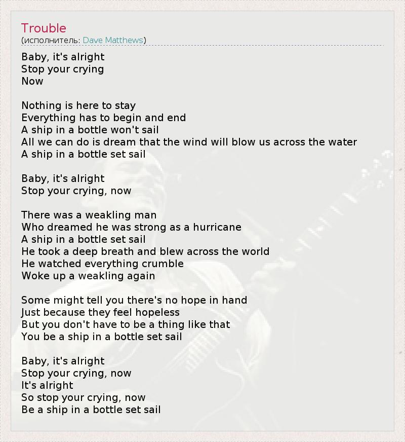 Baby, it's alright Stop your crying Now Nothing is here to stay Everything has to begin and end A ship in a bottle won't sail All we can do is dream that the wind will blow us across the water A ship in a bottle set sail Baby, it's alright Stop your crying, now There was a weakling man Who dreamed he was strong as a hurricane A ship in a bottle set sail He took a deep breath and blew across the world He watched everything crumble Woke up a weakling again Some might tell you there's no hope in hand Just because they feel hopeless But you don't have to be a thing like that You be a ship in a bottle set sail Baby, it's alright Stop your crying, now It's alright So stop your crying, now Be a ship in a bottle set sail