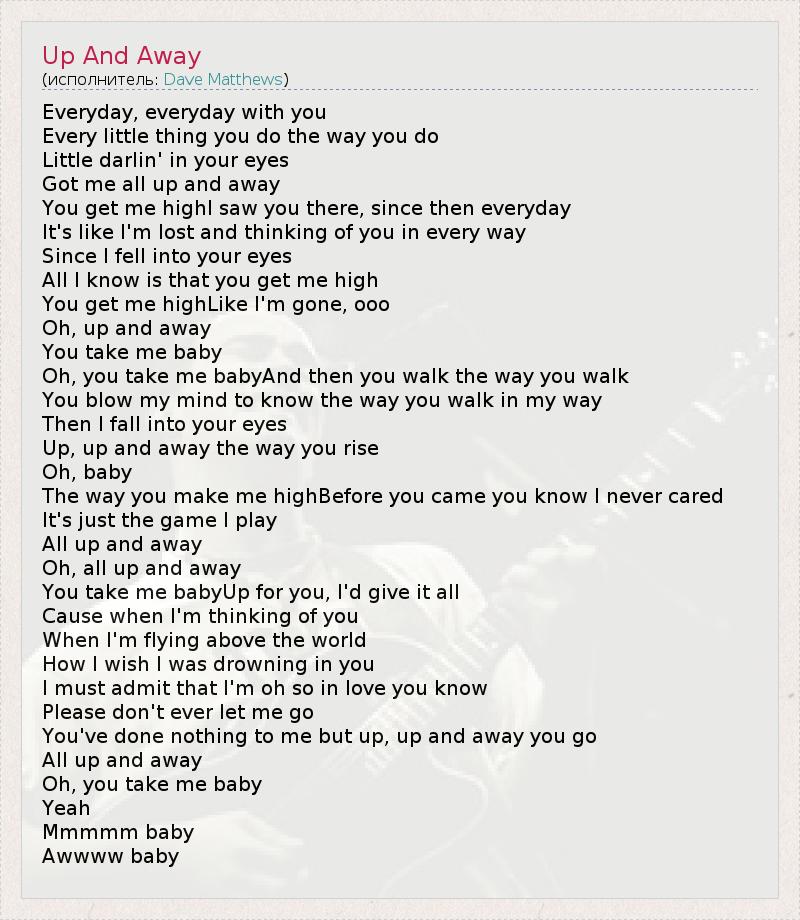 Everyday, everyday with you Every little thing you do the way you do Little darlin' in your eyes Got me all up and away You get me highI saw you there, since then everyday It's like I'm lost and thinking of you in every way Since I fell into your eyes All I know is that you get me high You get me highLike I'm gone, ooo Oh, up and away You take me baby Oh, you take me babyAnd then you walk the way you walk You blow my mind to know the way you walk in my way Then I fall into your eyes Up, up and away the way you rise Oh, baby The way you make me highBefore you came you know I never cared It's just the game I play All up and away Oh, all up and away You take me babyUp for you, I'd give it all Cause when I'm thinking of you When I'm flying above the world How I wish I was drowning in you I must admit that I'm oh so in love you know Please don't ever let me go You've done nothing to me but up, up and away you go All up and away Oh, you take me baby Yeah Mmmmm baby Awwww baby