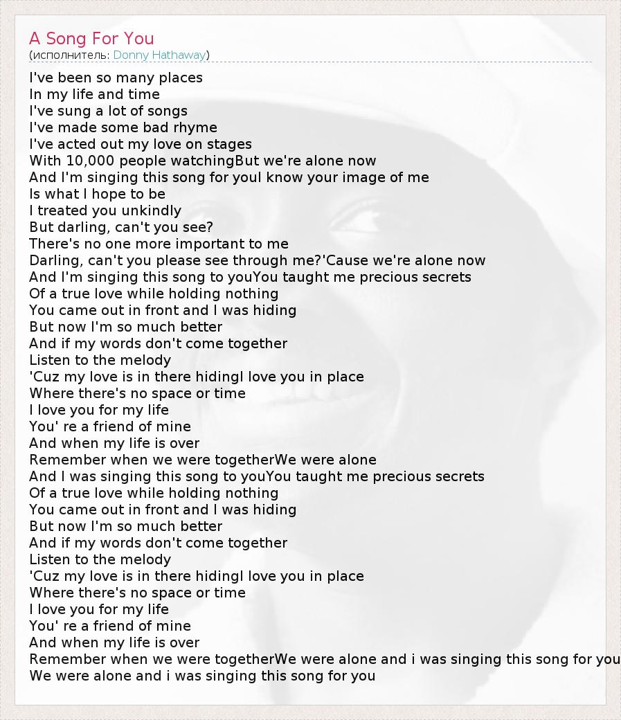 I've been so many places In my life and time I've sung a lot of songs I've made some bad rhyme I've acted out my love on stages With 10,000 people watchingBut we're alone now And I'm singing this song for youI know your image of me Is what I hope to be I treated you unkindly But darling, can't you see? There's no one more important to me Darling, can't you please see through me?'Cause we're alone now And I'm singing this song to youYou taught me precious secrets Of a true love while holding nothing You came out in front and I was hiding But now I'm so much better And if my words don't come together Listen to the melody 'Cuz my love is in there hidingI love you in place Where there's no space or time I love you for my life You' re a friend of mine And when my life is over Remember when we were togetherWe were alone And I was singing this song to youYou taught me precious secrets Of a true love while holding nothing You came out in front and I was hiding But now I'm so much better And if my words don't come together Listen to the melody 'Cuz my love is in there hidingI love you in place Where there's no space or time I love you for my life You' re a friend of mine And when my life is over Remember when we were togetherWe were alone and i was singing this song for you We were alone and i was singing this song for you