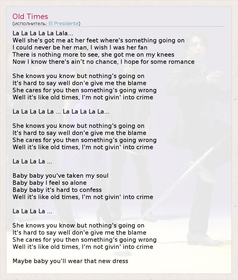 La La La La La Lala... Well she's got me at her feet where's something going on I could never be her man, I wish I was her fan There is nothing more to see, she got me on my knees Now I know there's ain't no chance, I hope for some romance She knows you know but nothing's going on It's hard to say well don'e give me the blame She cares for you then something's going wrong Well it's like old times, I'm not givin' into crime La La La La La ... La La La La La... She knows you know but nothing's going on It's hard to say well don'e give me the blame She cares for you then something's going wrong Well it's like old times, I'm not givin' into crime La La La La ... Baby baby you've taken my soul Baby baby I feel so alone Baby baby it's hard to confess Well it's like old times, I'm not givin' into crime La La La La ... She knows you know but nothing's going on It's hard to say well don'e give me the blame She cares for you then something's going wrong Well it's like old times, I'm not givin' into crime Maybe baby you'll wear that new dress