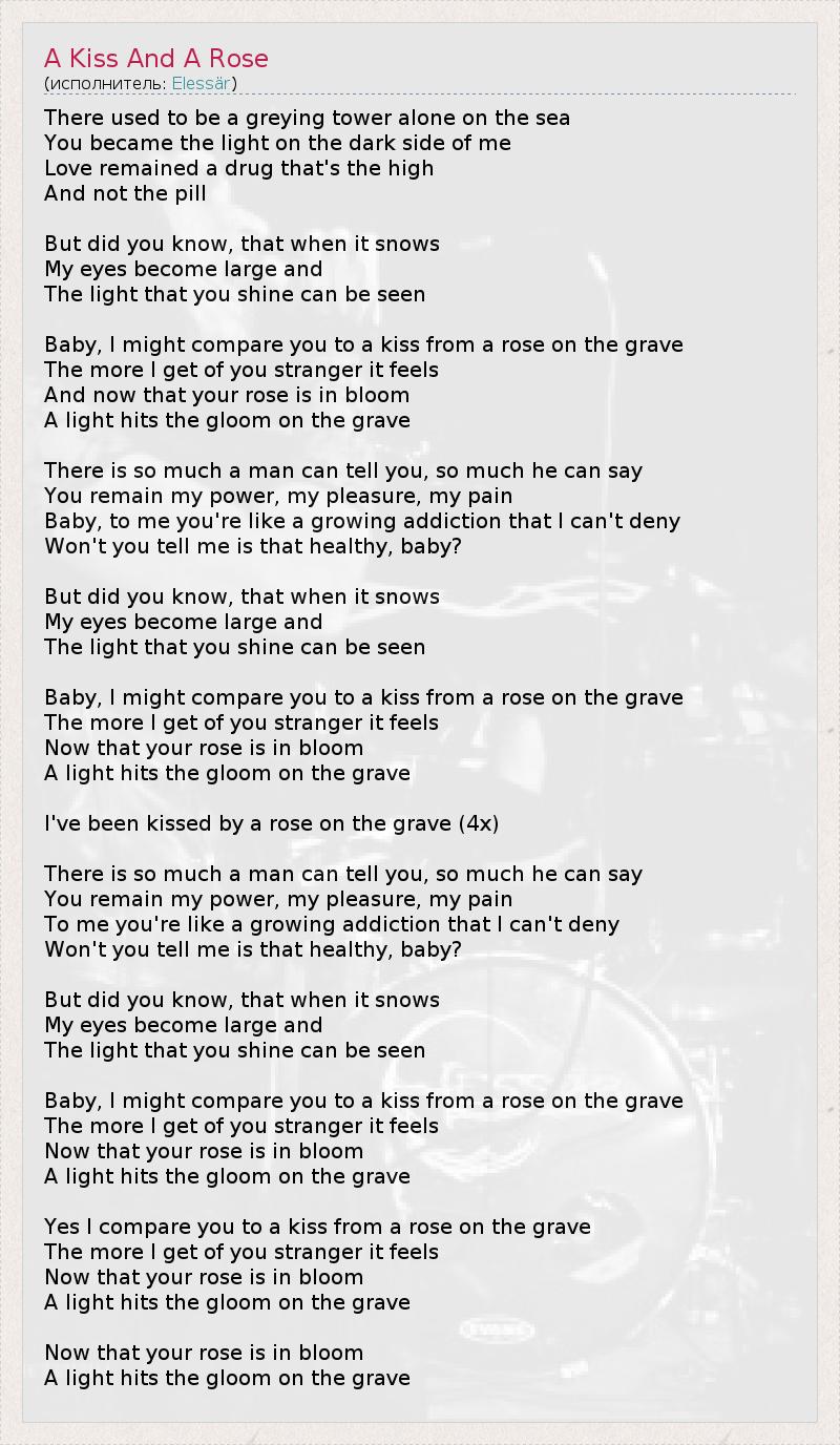 There used to be a greying tower alone on the sea You became the light on the dark side of me Love remained a drug that's the high And not the pill But did you know, that when it snows My eyes become large and The light that you shine can be seen Baby, I might compare you to a kiss from a rose on the grave The more I get of you stranger it feels And now that your rose is in bloom A light hits the gloom on the grave There is so much a man can tell you, so much he can say You remain my power, my pleasure, my pain Baby, to me you're like a growing addiction that I can't deny Won't you tell me is that healthy, baby? But did you know, that when it snows My eyes become large and The light that you shine can be seen Baby, I might compare you to a kiss from a rose on the grave The more I get of you stranger it feels Now that your rose is in bloom A light hits the gloom on the grave I've been kissed by a rose on the grave (4x) There is so much a man can tell you, so much he can say You remain my power, my pleasure, my pain To me you're like a growing addiction that I can't deny Won't you tell me is that healthy, baby? But did you know, that when it snows My eyes become large and The light that you shine can be seen Baby, I might compare you to a kiss from a rose on the grave The more I get of you stranger it feels Now that your rose is in bloom A light hits the gloom on the grave Yes I compare you to a kiss from a rose on the grave The more I get of you stranger it feels Now that your rose is in bloom A light hits the gloom on the grave Now that your rose is in bloom A light hits the gloom on the grave