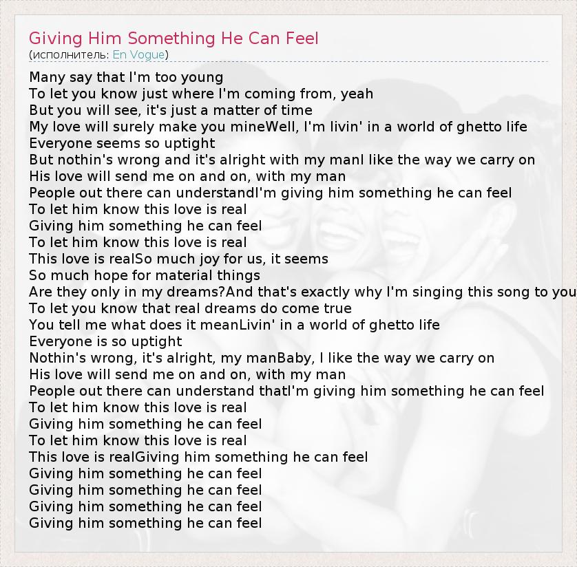 А как ты думаешь, о чем песня "Giving Him Something He Can Feel" ?