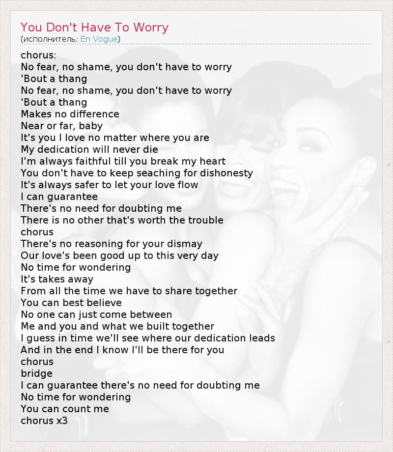 chorus: No fear, no shame, you don't have to worry 'Bout a thang No fear, no shame, you don't have to worry 'Bout a thang Makes no difference Near or far, baby It's you I love no matter where you are My dedication will never die I'm always faithful till you break my heart You don't have to keep seaching for dishonesty It's always safer to let your love flow I can guarantee There's no need for doubting me There is no other that's worth the trouble chorus There's no reasoning for your dismay Our love's been good up to this very day No time for wondering It's takes away From all the time we have to share together You can best believe No one can just come between Me and you and what we built together I guess in time we'll see where our dedication leads And in the end I know I'll be there for you chorus bridge I can guarantee there's no need for doubting me No time for wondering You can count me chorus x3