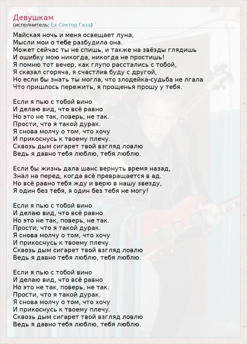Майская ночь и меня освещает луна, Мысли мои о тебе разбудила она. Может сейчас ты не спишь, и также на звёзды глядишь И ошибку мою никогда, никогда не простишь! Я помню тот вечер, как глупо расстались с тобой, Я сказал сгоряча, я счастлив буду с другой, Но если бы знать ты могла, что злодейка-судьба не лгала Что пришлось пережить, я прощенья прошу у тебя. Если я пью с тобой вино И делаю вид, что всё равно Но это не так, поверь, не так. Прости, что я такой дурак. Я снова молчу о том, что хочу И прикоснусь к твоему плечу. Сквозь дым сигарет твой взгляд ловлю Ведь я давно тебя люблю, тебя люблю. Если бы жизнь дала шанс вернуть время назад, Знал на перед, когда всё превращается в ад. Но всё равно тебя жду и верю в нашу звезду, Я один без тебя, я один без тебя не могу! Если я пью с тобой вино И делаю вид, что всё равно Но это не так, поверь, не так. Прости, что я такой дурак. Я снова молчу о том, что хочу И прикоснусь к твоему плечу. Сквозь дым сигарет твой взгляд ловлю Ведь я давно тебя люблю, тебя люблю. Если я пью с тобой вино И делаю вид, что всё равно Но это не так, поверь, не так. Прости, что я такой дурак. Я снова молчу о том, что хочу И прикоснусь к твоему плечу. Сквозь дым сигарет твой взгляд ловлю Ведь я давно тебя люблю, тебя люблю.