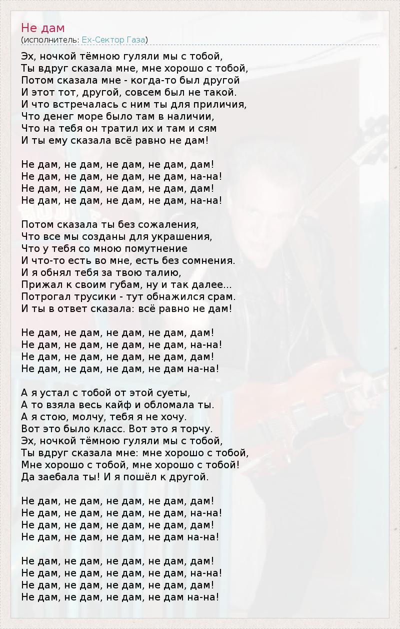 Эх, ночкой тёмною гуляли мы с тобой, Ты вдруг сказала мне, мне хорошо с тобой, Потом сказала мне - когда-то был другой И этот тот, другой, совсем был не такой. И что встречалась с ним ты для приличия, Что денег море было там в наличии, Что на тебя он тратил их и там и сям И ты ему сказала всё равно не дам! Не дам, не дам, не дам, не дам, дам! Не дам, не дам, не дам, не дам, на-на! Не дам, не дам, не дам, не дам, дам! Не дам, не дам, не дам, не дам, на-на! Потом сказала ты без сожаления, Что все мы созданы для украшения, Что у тебя со мною помутнение И что-то есть во мне, есть без сомнения. И я обнял тебя за твою талию, Прижал к своим губам, ну и так далее... Потрогал трусики - тут обнажился срам. И ты в ответ сказала: всё равно не дам! Не дам, не дам, не дам, не дам, дам! Не дам, не дам, не дам, не дам, на-на! Не дам, не дам, не дам, не дам, дам! Не дам, не дам, не дам, не дам на-на! А я устал с тобой от этой суеты, А то взяла весь кайф и обломала ты. А я стою, молчу, тебя я не хочу. Вот это было класс. Вот это я торчу. Эх, ночкой тёмною гуляли мы с тобой, Ты вдруг сказала мне: мне хорошо с тобой, Мне хорошо с тобой, мне хорошо с тобой! Да заебала ты! И я пошёл к другой. Не дам, не дам, не дам, не дам, дам! Не дам, не дам, не дам, не дам, на-на! Не дам, не дам, не дам, не дам, дам! Не дам, не дам, не дам, не дам на-на! Не дам, не дам, не дам, не дам, дам! Не дам, не дам, не дам, не дам, на-на! Не дам, не дам, не дам, не дам, дам! Не дам, не дам, не дам, не дам на-на!