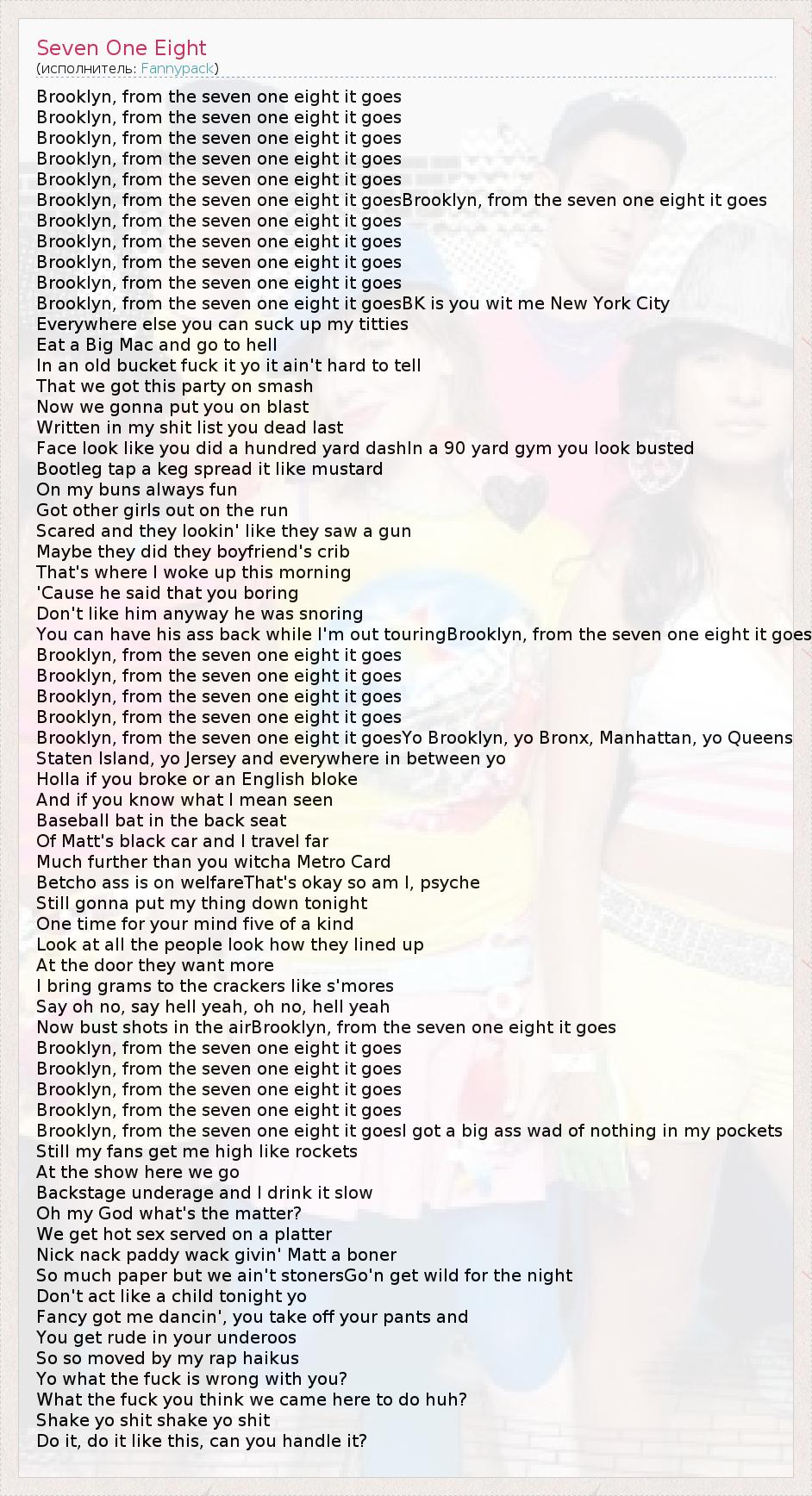Brooklyn, from the seven one eight it goes Brooklyn, from the seven one eight it goes Brooklyn, from the seven one eight it goes Brooklyn, from the seven one eight it goes Brooklyn, from the seven one eight it goes Brooklyn, from the seven one eight it goesBrooklyn, from the seven one eight it goes Brooklyn, from the seven one eight it goes Brooklyn, from the seven one eight it goes Brooklyn, from the seven one eight it goes Brooklyn, from the seven one eight it goes Brooklyn, from the seven one eight it goesBK is you wit me New York City Everywhere else you can suck up my titties Eat a Big Mac and go to hell In an old bucket fuck it yo it ain't hard to tell That we got this party on smash Now we gonna put you on blast Written in my shit list you dead last Face look like you did a hundred yard dashIn a 90 yard gym you look busted Bootleg tap a keg spread it like mustard On my buns always fun Got other girls out on the run Scared and they lookin' like they saw a gun Maybe they did they boyfriend's crib That's where I woke up this morning 'Cause he said that you boring Don't like him anyway he was snoring You can have his ass back while I'm out touringBrooklyn, from the seven one eight it goes Brooklyn, from the seven one eight it goes Brooklyn, from the seven one eight it goes Brooklyn, from the seven one eight it goes Brooklyn, from the seven one eight it goes Brooklyn, from the seven one eight it goesYo Brooklyn, yo Bronx, Manhattan, yo Queens Staten Island, yo Jersey and everywhere in between yo Holla if you broke or an English bloke And if you know what I mean seen Baseball bat in the back seat Of Matt's black car and I travel far Much further than you witcha Metro Card Betcho ass is on welfareThat's okay so am I, psyche Still gonna put my thing down tonight One time for your mind five of a kind Look at all the people look how they lined up At the door they want more I bring grams to the crackers like s'mores Say oh no, say hell yeah, oh no, hell yeah Now bust shots in the airBrooklyn, from the seven one eight it goes Brooklyn, from the seven one eight it goes Brooklyn, from the seven one eight it goes Brooklyn, from the seven one eight it goes Brooklyn, from the seven one eight it goes Brooklyn, from the seven one eight it goesI got a big ass wad of nothing in my pockets Still my fans get me high like rockets At the show here we go Backstage underage and I drink it slow Oh my God what's the matter? We get hot sex served on a platter Nick nack paddy wack givin' Matt a boner So much paper but we ain't stonersGo'n get wild for the night Don't act like a child tonight yo Fancy got me dancin', you take off your pants and You get rude in your underoos So so moved by my rap haikus Yo what the fuck is wrong with you? What the fuck you think we came here to do huh? Shake yo shit shake yo shit Do it, do it like this, can you handle it?