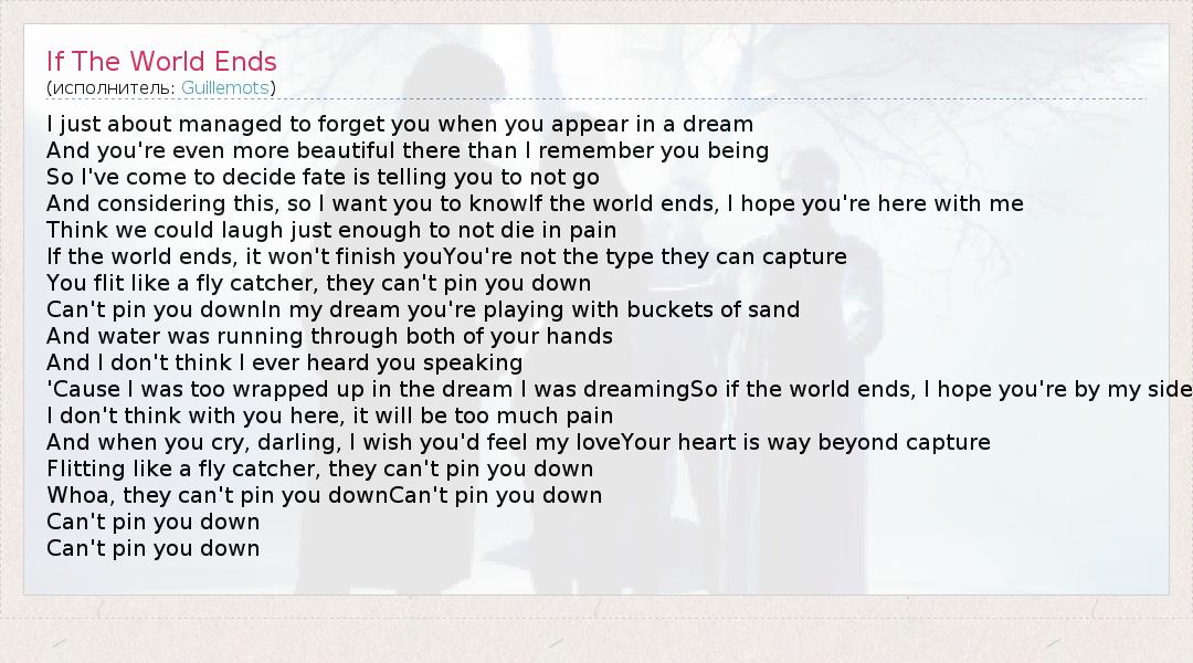 I just about managed to forget you when you appear in a dream And you're even more beautiful there than I remember you being So I've come to decide fate is telling you to not go And considering this, so I want you to knowIf the world ends, I hope you're here with me Think we could laugh just enough to not die in pain If the world ends, it won't finish youYou're not the type they can capture You flit like a fly catcher, they can't pin you down Can't pin you downIn my dream you're playing with buckets of sand And water was running through both of your hands And I don't think I ever heard you speaking 'Cause I was too wrapped up in the dream I was dreamingSo if the world ends, I hope you're by my side I don't think with you here, it will be too much pain And when you cry, darling, I wish you'd feel my loveYour heart is way beyond capture Flitting like a fly catcher, they can't pin you down Whoa, they can't pin you downCan't pin you down Can't pin you down Can't pin you down