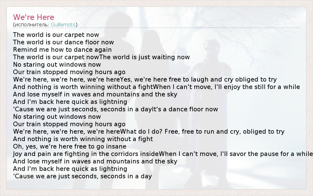 The world is our carpet now The world is our dance floor now Remind me how to dance again The world is our carpet nowThe world is just waiting now No staring out windows now Our train stopped moving hours ago We're here, we're here, we're hereYes, we're here free to laugh and cry obliged to try And nothing is worth winning without a fightWhen I can't move, I'll enjoy the still for a while And lose myself in waves and mountains and the sky And I'm back here quick as lightning 'Cause we are just seconds, seconds in a dayIt's a dance floor now No staring out windows now Our train stopped moving hours ago We're here, we're here, we're hereWhat do I do? Free, free to run and cry, obliged to try And nothing is worth winning without a fight Oh, yes, we're here free to go insane Joy and pain are fighting in the corridors insideWhen I can't move, I'll savor the pause for a while And lose myself in waves and mountains and the sky And I'm back here quick as lightning 'Cause we are just seconds, seconds in a day