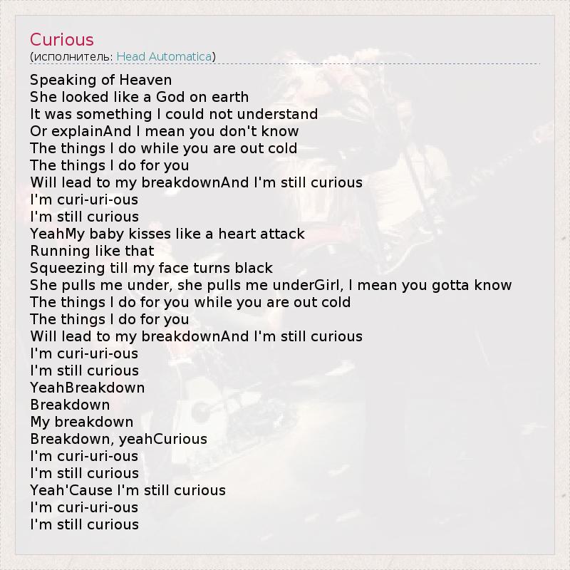 Speaking of Heaven She looked like a God on earth It was something I could not understand Or explainAnd I mean you don't know The things I do while you are out cold The things I do for you Will lead to my breakdownAnd I'm still curious I'm curi-uri-ous I'm still curious YeahMy baby kisses like a heart attack Running like that Squeezing till my face turns black She pulls me under, she pulls me underGirl, I mean you gotta know The things I do for you while you are out cold The things I do for you Will lead to my breakdownAnd I'm still curious I'm curi-uri-ous I'm still curious YeahBreakdown Breakdown My breakdown Breakdown, yeahCurious I'm curi-uri-ous I'm still curious Yeah'Cause I'm still curious I'm curi-uri-ous I'm still curious