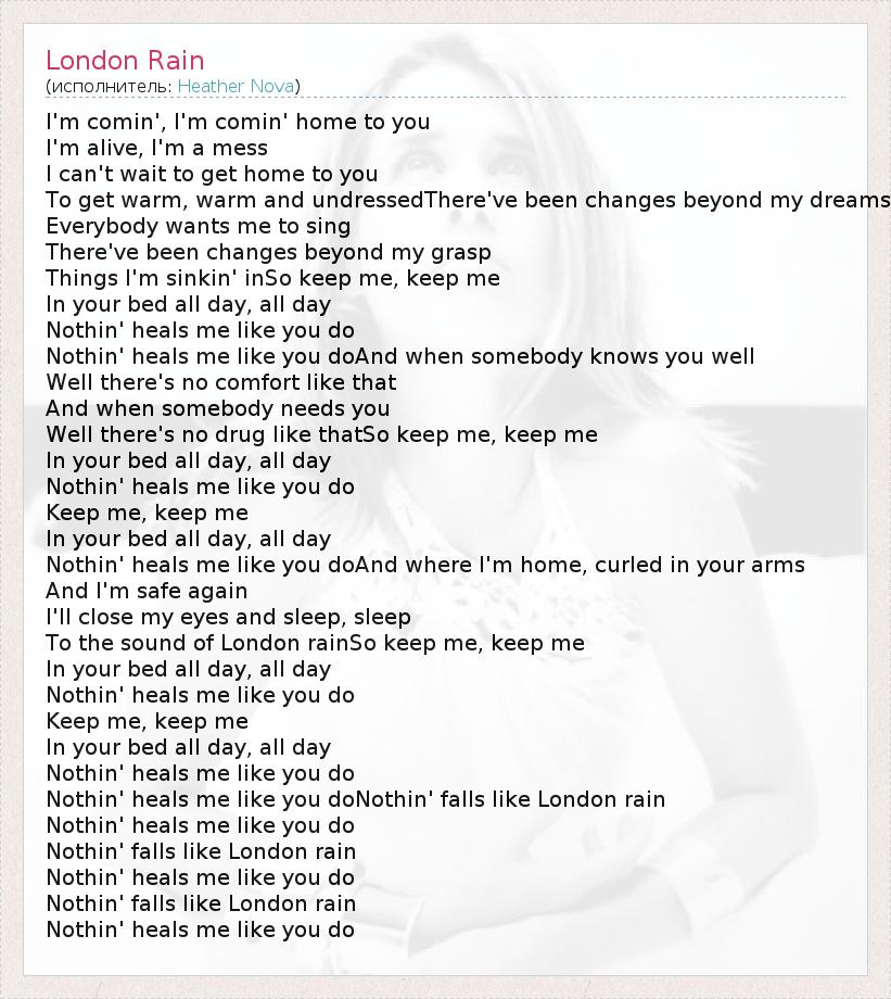 I'm comin', I'm comin' home to you I'm alive, I'm a mess I can't wait to get home to you To get warm, warm and undressedThere've been changes beyond my dreams Everybody wants me to sing There've been changes beyond my grasp Things I'm sinkin' inSo keep me, keep me In your bed all day, all day Nothin' heals me like you do Nothin' heals me like you doAnd when somebody knows you well Well there's no comfort like that And when somebody needs you Well there's no drug like thatSo keep me, keep me In your bed all day, all day Nothin' heals me like you do Keep me, keep me In your bed all day, all day Nothin' heals me like you doAnd where I'm home, curled in your arms And I'm safe again I'll close my eyes and sleep, sleep To the sound of London rainSo keep me, keep me In your bed all day, all day Nothin' heals me like you do Keep me, keep me In your bed all day, all day Nothin' heals me like you do Nothin' heals me like you doNothin' falls like London rain Nothin' heals me like you do Nothin' falls like London rain Nothin' heals me like you do Nothin' falls like London rain Nothin' heals me like you do