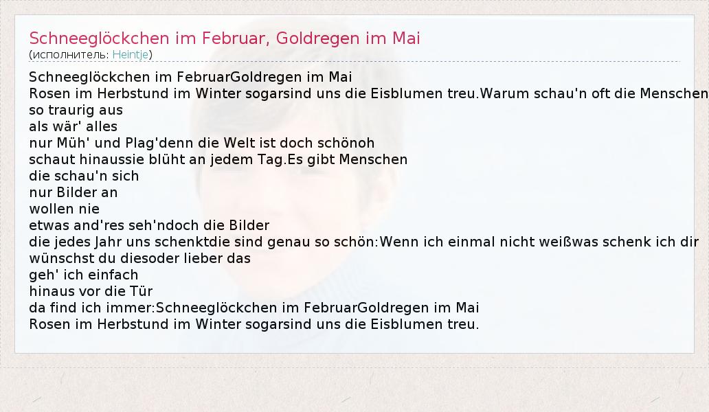 Schneeglöckchen im FebruarGoldregen im Mai Rosen im Herbstund im Winter sogarsind uns die Eisblumen treu.Warum schau'n oft die Menschen so traurig aus als wär' alles nur Müh' und Plag'denn die Welt ist doch schönoh schaut hinaussie blüht an jedem Tag.Es gibt Menschen die schau'n sich nur Bilder an wollen nie etwas and'res seh'ndoch die Bilder die jedes Jahr uns schenktdie sind genau so schön:Wenn ich einmal nicht weißwas schenk ich dir wünschst du diesoder lieber das geh' ich einfach hinaus vor die Tür da find ich immer:Schneeglöckchen im FebruarGoldregen im Mai Rosen im Herbstund im Winter sogarsind uns die Eisblumen treu.
