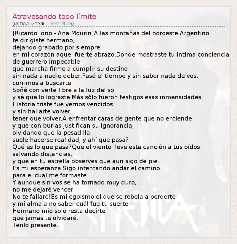 [Ricardo Iorio - Ana Mourin]A las montañas del noroeste Argentino te dirigiste hermano, dejando grabado por siempre en mi corazón aquel fuerte abrazo.Donde mostraste tu íntima conciencia de guerrero impecable que marcha firme a cumplir su destino sin nada a nadie deber.Pasó el tiempo y sin saber nada de vos, corrimos a buscarte. Soñé con verte libre a la luz del sol y sé que lo lograste.Más sólo fueron testigos esas inmensidades. Historia triste fue vernos vencidos y sin hallarte volver, tener que volver.A enfrentar caras de gente que no entiende y que con burlas justifican su ignorancia, olvidando que la pesadilla suele hacerse realidad, y ahí que pasa? Qué es lo que pasa?Que el viento lleve esta canción a tus oídos salvando distancias, y que en tu estrella observes que aun sigo de pie. Es mi esperanza.Sigo intentando andar el camino para el cual me formaste. Y aunque sin vos se ha tornado muy duro, no me dejaré vencer. No te fallaré!Es mi egoísmo el que se rebela a perderte y mi alma a no saber cuál fue tu suerte Hermano mio solo resta decirte que jamas te olvidaré. Tenlo presente..