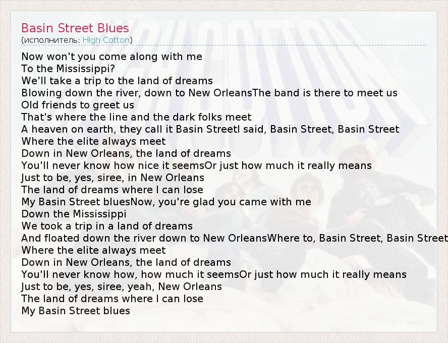 Now won't you come along with me To the Mississippi? We'll take a trip to the land of dreams Blowing down the river, down to New OrleansThe band is there to meet us Old friends to greet us That's where the line and the dark folks meet A heaven on earth, they call it Basin StreetI said, Basin Street, Basin Street Where the elite always meet Down in New Orleans, the land of dreams You'll never know how nice it seemsOr just how much it really means Just to be, yes, siree, in New Orleans The land of dreams where I can lose My Basin Street bluesNow, you're glad you came with me Down the Mississippi We took a trip in a land of dreams And floated down the river down to New OrleansWhere to, Basin Street, Basin Street Where the elite always meet Down in New Orleans, the land of dreams You'll never know how, how much it seemsOr just how much it really means Just to be, yes, siree, yeah, New Orleans The land of dreams where I can lose My Basin Street blues