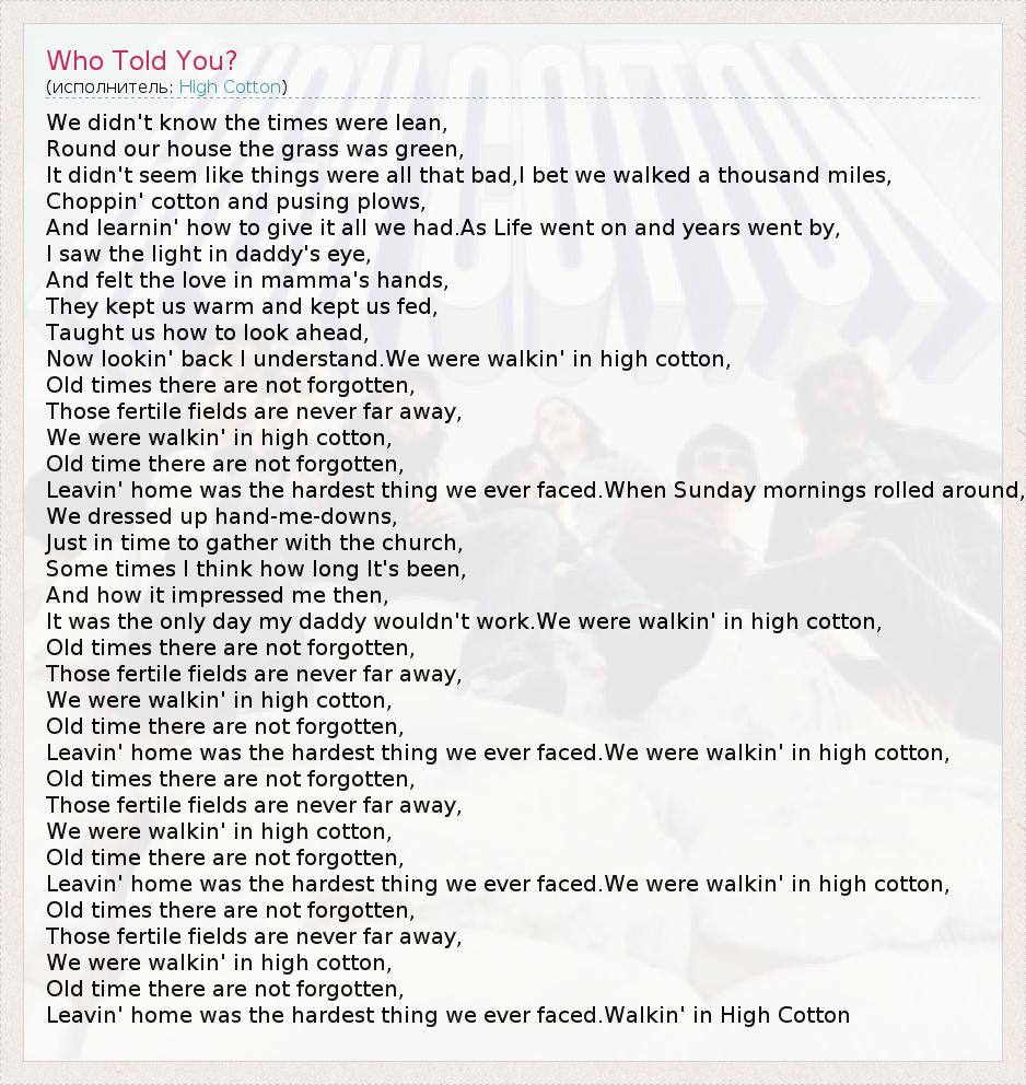 Leavin' home was the hardest thing we ever faced.Walkin' in High Cotton