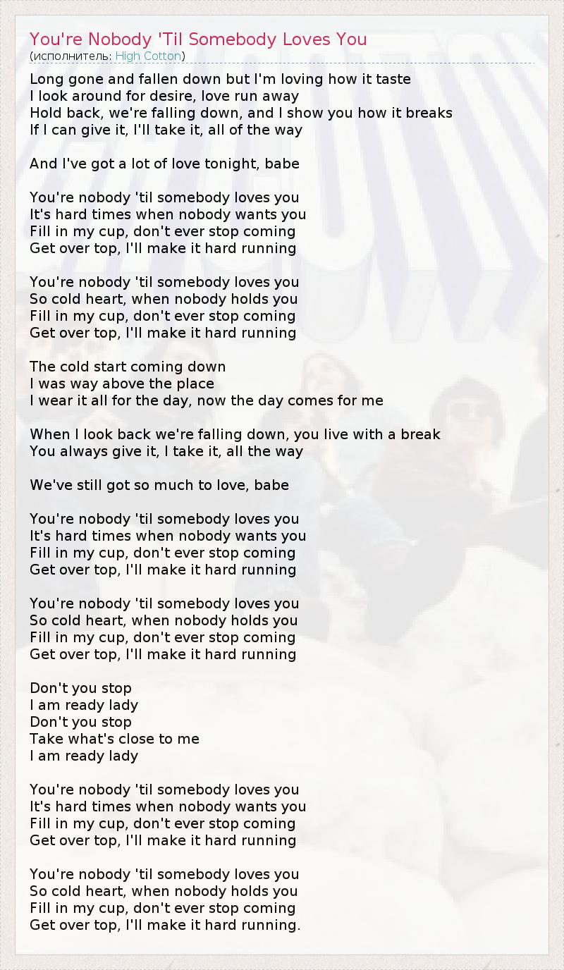Long gone and fallen down but I'm loving how it taste I look around for desire, love run away Hold back, we're falling down, and I show you how it breaks If I can give it, I'll take it, all of the way And I've got a lot of love tonight, babe You're nobody 'til somebody loves you It's hard times when nobody wants you Fill in my cup, don't ever stop coming Get over top, I'll make it hard running You're nobody 'til somebody loves you So cold heart, when nobody holds you Fill in my cup, don't ever stop coming Get over top, I'll make it hard running The cold start coming down I was way above the place I wear it all for the day, now the day comes for me When I look back we're falling down, you live with a break You always give it, I take it, all the way We've still got so much to love, babe You're nobody 'til somebody loves you It's hard times when nobody wants you Fill in my cup, don't ever stop coming Get over top, I'll make it hard running You're nobody 'til somebody loves you So cold heart, when nobody holds you Fill in my cup, don't ever stop coming Get over top, I'll make it hard running Don't you stop I am ready lady Don't you stop Take what's close to me I am ready lady You're nobody 'til somebody loves you It's hard times when nobody wants you Fill in my cup, don't ever stop coming Get over top, I'll make it hard running You're nobody 'til somebody loves you So cold heart, when nobody holds you Fill in my cup, don't ever stop coming Get over top, I'll make it hard running.