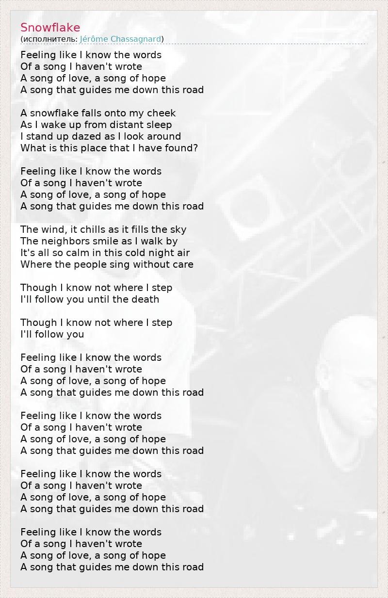 Feeling like I know the words Of a song I haven't wrote A song of love, a song of hope A song that guides me down this road A snowflake falls onto my cheek As I wake up from distant sleep I stand up dazed as I look around What is this place that I have found? Feeling like I know the words Of a song I haven't wrote A song of love, a song of hope A song that guides me down this road The wind, it chills as it fills the sky The neighbors smile as I walk by It's all so calm in this cold night air Where the people sing without care Though I know not where I step I'll follow you until the death Though I know not where I step I'll follow you Feeling like I know the words Of a song I haven't wrote A song of love, a song of hope A song that guides me down this road Feeling like I know the words Of a song I haven't wrote A song of love, a song of hope A song that guides me down this road Feeling like I know the words Of a song I haven't wrote A song of love, a song of hope A song that guides me down this road Feeling like I know the words Of a song I haven't wrote A song of love, a song of hope A song that guides me down this road