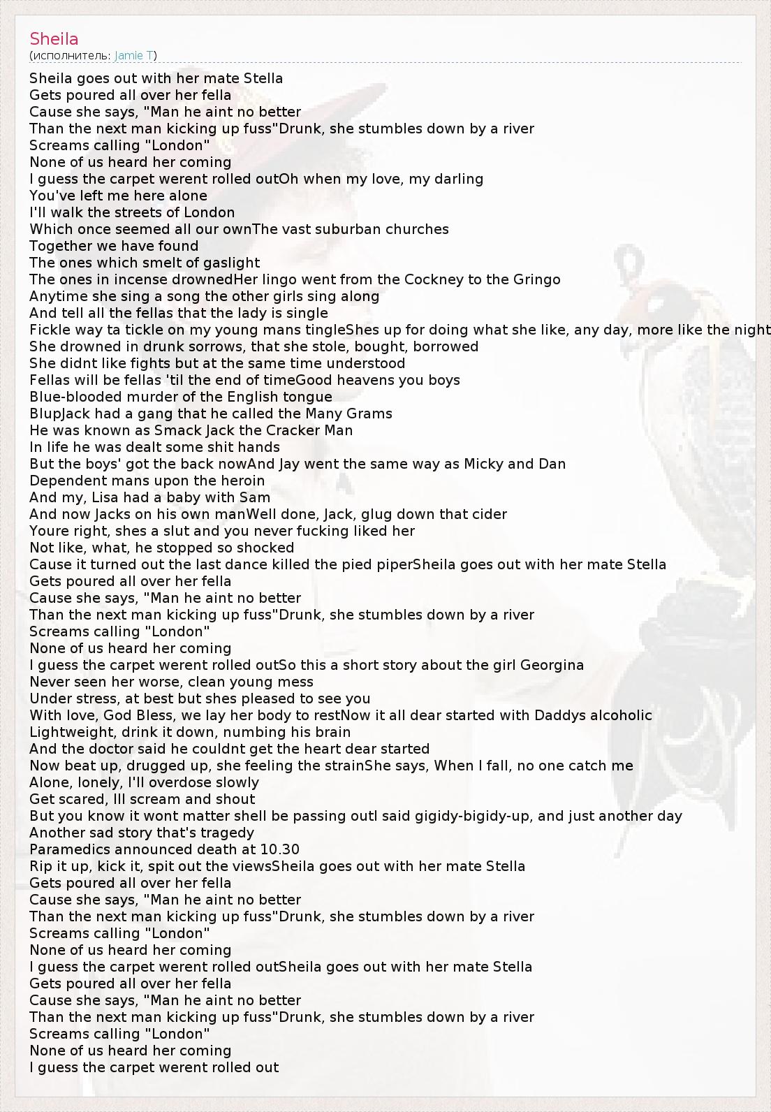 Sheila goes out with her mate Stella Gets poured all over her fella Cause she says, "Man he aint no better Than the next man kicking up fuss"Drunk, she stumbles down by a river Screams calling "London" None of us heard her coming I guess the carpet werent rolled outOh when my love, my darling You've left me here alone I'll walk the streets of London Which once seemed all our ownThe vast suburban churches Together we have found The ones which smelt of gaslight The ones in incense drownedHer lingo went from the Cockney to the Gringo Anytime she sing a song the other girls sing along And tell all the fellas that the lady is single Fickle way ta tickle on my young mans tingleShes up for doing what she like, any day, more like the night She drowned in drunk sorrows, that she stole, bought, borrowed She didnt like fights but at the same time understood Fellas will be fellas 'til the end of timeGood heavens you boys Blue-blooded murder of the English tongue BlupJack had a gang that he called the Many Grams He was known as Smack Jack the Cracker Man In life he was dealt some shit hands But the boys' got the back nowAnd Jay went the same way as Micky and Dan Dependent mans upon the heroin And my, Lisa had a baby with Sam And now Jacks on his own manWell done, Jack, glug down that cider Youre right, shes a slut and you never fucking liked her Not like, what, he stopped so shocked Cause it turned out the last dance killed the pied piperSheila goes out with her mate Stella Gets poured all over her fella Cause she says, "Man he aint no better Than the next man kicking up fuss"Drunk, she stumbles down by a river Screams calling "London" None of us heard her coming I guess the carpet werent rolled outSo this a short story about the girl Georgina Never seen her worse, clean young mess Under stress, at best but shes pleased to see you With love, God Bless, we lay her body to restNow it all dear started with Daddys alcoholic Lightweight, drink it down, numbing his brain And the doctor said he couldnt get the heart dear started Now beat up, drugged up, she feeling the strainShe says, When I fall, no one catch me Alone, lonely, I'll overdose slowly Get scared, Ill scream and shout But you know it wont matter shell be passing outI said gigidy-bigidy-up, and just another day Another sad story that's tragedy Paramedics announced death at 10.30 Rip it up, kick it, spit out the viewsSheila goes out with her mate Stella Gets poured all over her fella Cause she says, "Man he aint no better Than the next man kicking up fuss"Drunk, she stumbles down by a river Screams calling "London" None of us heard her coming I guess the carpet werent rolled outSheila goes out with her mate Stella Gets poured all over her fella Cause she says, "Man he aint no better Than the next man kicking up fuss"Drunk, she stumbles down by a river Screams calling "London" None of us heard her coming I guess the carpet werent rolled out