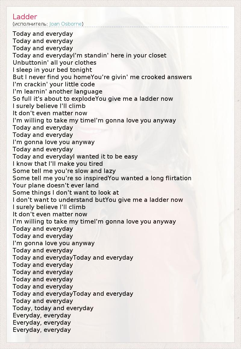 Today and everyday Today and everyday Today and everyday Today and everydayI'm standin' here in your closet Unbuttonin' all your clothes I sleep in your bed tonight But I never find you homeYou're givin' me crooked answers I'm crackin' your little code I'm learnin' another language So full it's about to explodeYou give me a ladder now I surely believe I'll climb It don't even matter now I'm willing to take my timeI'm gonna love you anyway Today and everyday Today and everyday I'm gonna love you anyway Today and everyday Today and everydayI wanted it to be easy I know that I'll make you tired Some tell me you're slow and lazy Some tell me you're so inspiredYou wanted a long flirtation Your plane doesn't ever land Some things I don't want to look at I don't want to understand butYou give me a ladder now I surely believe I'll climb It don't even matter now I'm willing to take my timeI'm gonna love you anyway Today and everyday Today and everyday I'm gonna love you anyway Today and everyday Today and everydayToday and everyday Today and everyday Today and everyday Today and everyday Today and everyday Today and everydayToday and everyday Today and everyday Today, today and everyday Everyday, everyday Everyday, everyday Everyday, everyday